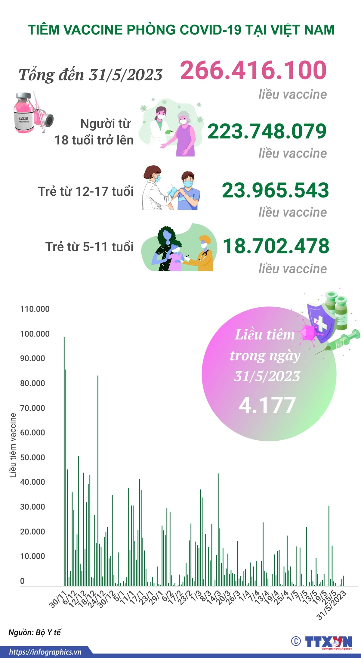 Trong ngày 31/5/2023 có 4.177 liều vaccine phòng COVID-19 được tiêm. Như vậy, tổng số liều vaccine đã được tiêm tại Việt Nam là 266.416.100 liều trong đó tiêm cho trẻ từ 5-11 tuổi là 18.702.478 liều, tiêm cho trẻ từ 12-17 tuổi là 23.965.543 liều và tiêm cho người từ 18 tuổi trở lên là 223.748.079 liều.