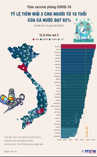 Tỷ lệ tiêm mũi 3 cho người từ 18 tuổi trở lên trung bình trên toàn quốc là 82,0% với tổng số 52.132.872 liều vaccine được tiêm.