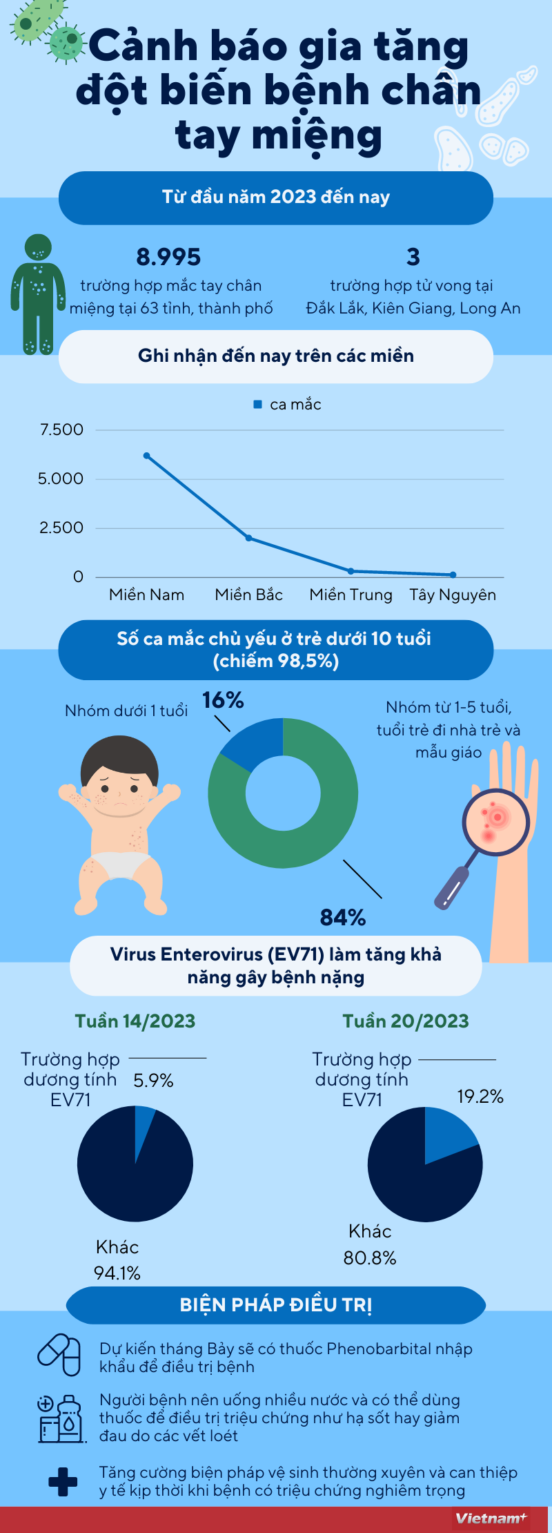 Số ca mắc tay chân miệng có xu hướng tăng nhanh trong các tuần gần đây đồng thời đã ghi nhận sự xuất hiện của virus Enterovirus (EV71) có khả năng gây bệnh nặng ở một số trường hợp mắc bệnh.
