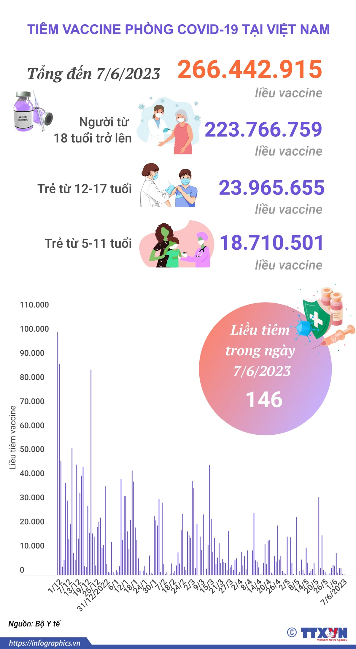 Trong ngày 7/6/2023 có 146 liều vaccine phòng COVID-19 được tiêm. Như vậy, tổng số liều vaccine đã được tiêm tại Việt Nam là 266.442.915 liều trong đó tiêm cho trẻ từ 5-11 tuổi là 18.710.501 liều, tiêm cho trẻ từ 12-17 tuổi là 23.965.655 liều và tiêm cho người từ 18 tuổi trở lên là 223.766.759 liều.