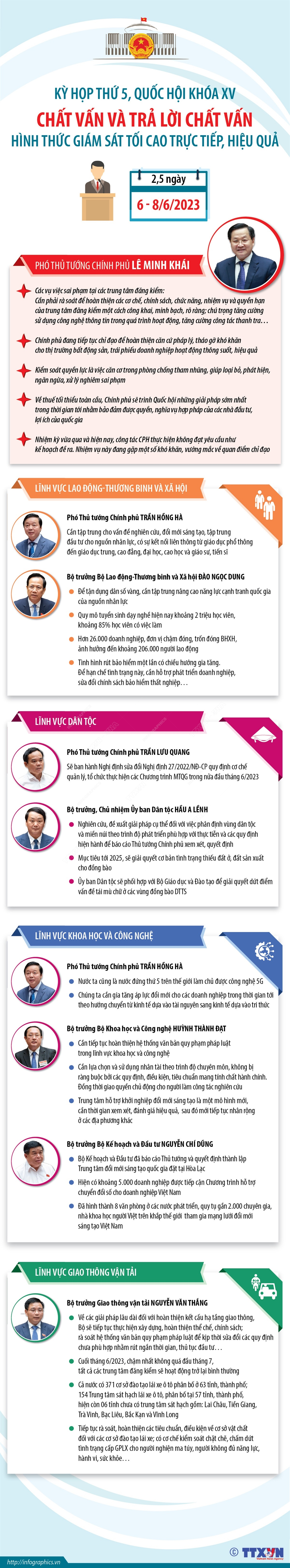 Sau hai ngày rưỡi làm việc, Quốc hội đã hoàn thành tốt đẹp phiên chất vấn và trả lời chất vấn tại Kỳ họp thứ 5. Từ 136 nhóm vấn đề, Quốc hội xem xét, quyết định 4 nhóm vấn đề và tổ chức chất vấn, gồm: Lao động-Thương binh và Xã hội; Khoa học và Công nghệ; Giao thông Vận tải; Dân tộc. Tại kỳ họp này có 454 lượt đại biểu Quốc hội đã đăng ký tham gia chất vấn; 112 lượt đại biểu Quốc hội đã thực hiện quyền chất vấn, 49 lượt đại biểu Quốc hội đã tiến hành tranh luận để làm rõ hơn những vấn đề mà đại biểu quan tâm; nâng tổng số đại biểu tham gia chất vấn của 2 năm đầu nhiệm kỳ Quốc hội khóa XV lên 861 lượt người, tiếp tục khẳng định chất vấn và trả lời chất vấn là hình thức giám sát tối cao trực tiếp, được đại biểu Quốc hội rất quan tâm và rất có hiệu quả.
