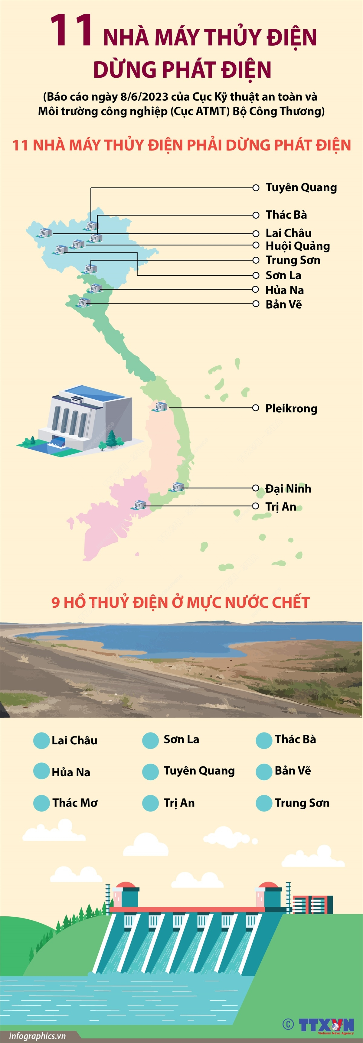 Theo báo cáo ngày 8/6/2023 của Cục Kỹ thuật an toàn và Môi trường công nghiệp (Bộ Công Thương), để đảm bảo vận hành, các tổ máy tại 11 nhà máy như: Sơn La, Lai Châu, Huội Quảng, Thác Bà, Tuyên Quang, Bản Vẽ, Hủa Na, Trung Sơn, Trị An, Đại Ninh, Pleikrong phải dừng phát điện.