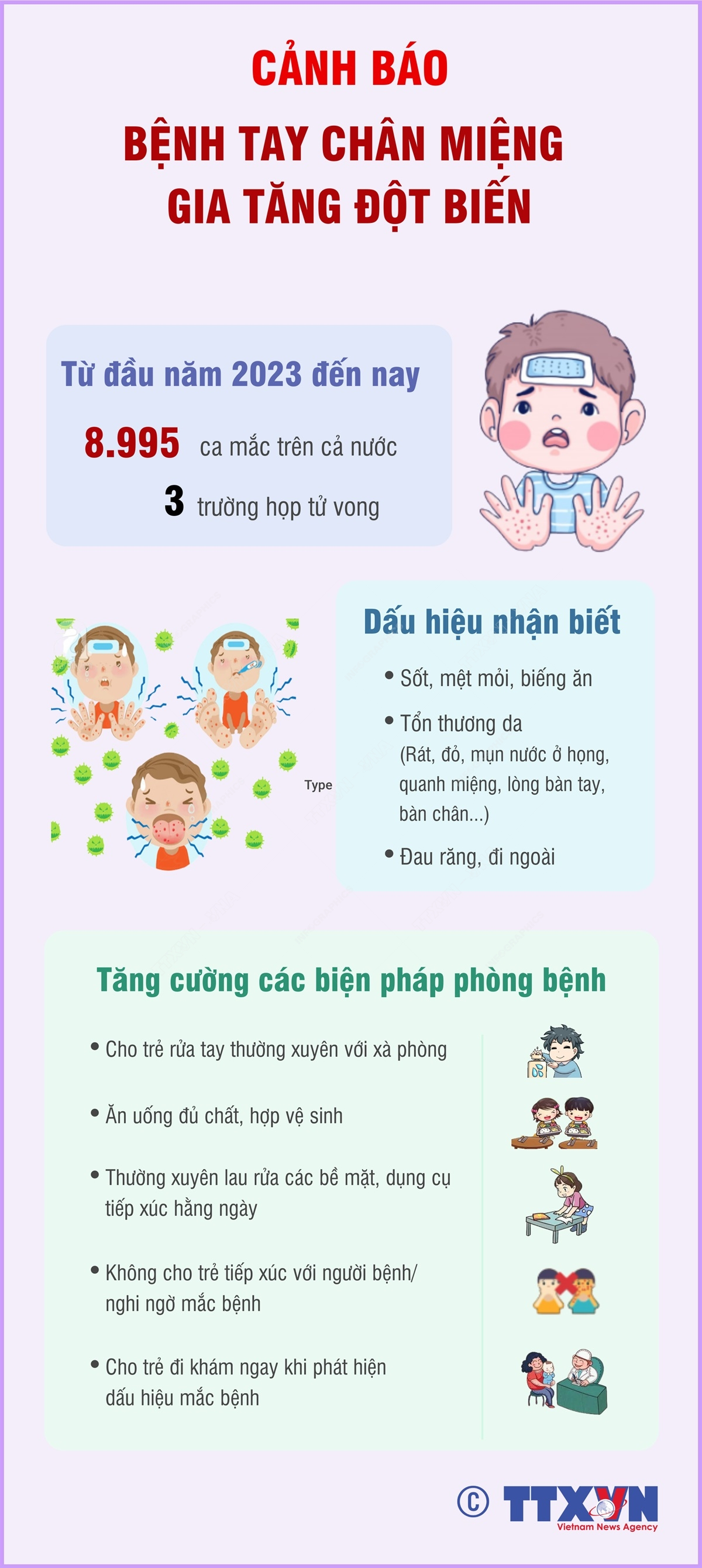 Theo hệ thống giám sát bệnh truyền nhiễm, từ đầu năm đến nay cả nước đã ghi nhận gần 9.000 trường hợp mắc tay chân miệng. Đáng lo ngại, số ca mắc tay chân miệng có xu hướng tăng nhanh trong các tuần gần đây. Bộ Y tế khuyến cáo các địa phương và người dân cần tăng cường hơn nữa các biện pháp phòng bệnh.