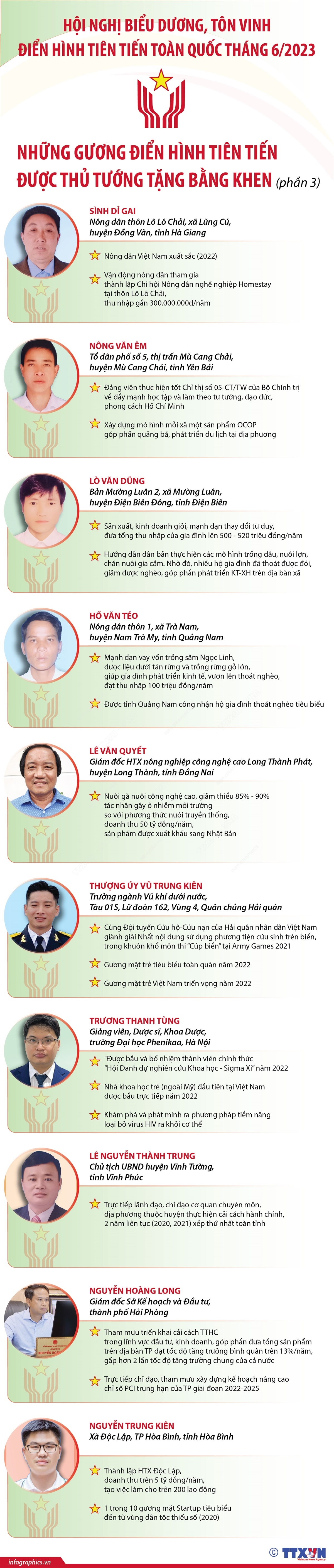 Thủ tướng Chính phủ đã tặng Bằng khen cho những gương điển hình tiên tiến tiêu biểu dự Hội nghị biểu dương, tôn vinh điển hình tiên tiến toàn quốc diễn ra tại Hà Nội ngày 11/6/2023, nhân kỷ niệm 75 năm ngày Chủ tịch Hồ Chí Minh ra Lời kêu gọi thi đua ái quốc (11/6/1948 - 11/6/2023).