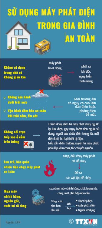 Máy phát điện là thiết bị mỗi gia đình có thể sử dụng khi xảy ra tình trạng cắt điện, nhưng không phải ai cũng biết cách sử dụng máy phát điện một cách an toàn và hiệu quả. Để bảo đảm an toàn khi sử dụng máy phát điện nhỏ trong gia đình, Tập đoàn Điện lực Việt Nam (EVN) khuyến cáo người dân cần lưu ý một số vấn đề.