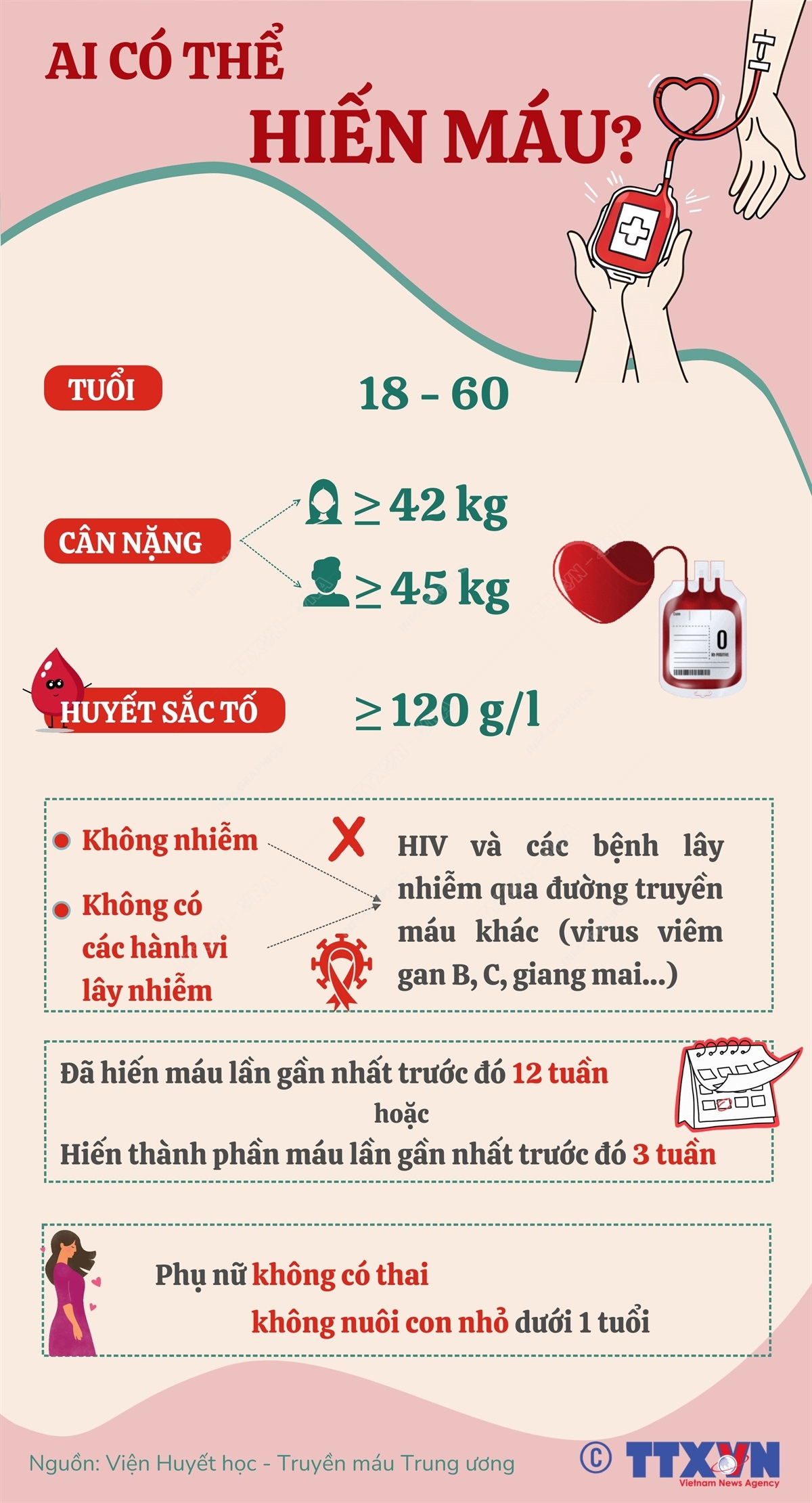 Để có thể hiến máu cần các tiêu chuẩn như: Tiêu chuẩn về tuổi, cân nặng, huyết sắc tố của người hiến máu. Người hiến máu không bị nhiễm hoặc không có các hành vi lây nhiễm HIV và các bệnh lây nhiễm qua đường truyền máu khác…