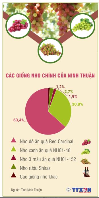 Toàn tỉnh Ninh Thuận hiện có 3 giống nho ăn quả chính là nho Red Cardinal (chiếm 63,4%), nho xanh NH01-48 (chiếm 30,8%) và nho 3 màu NH01-152 (chiếm 1,9%). Phần nhỏ diện tích còn lại là các giống nho chế biến rượu.
