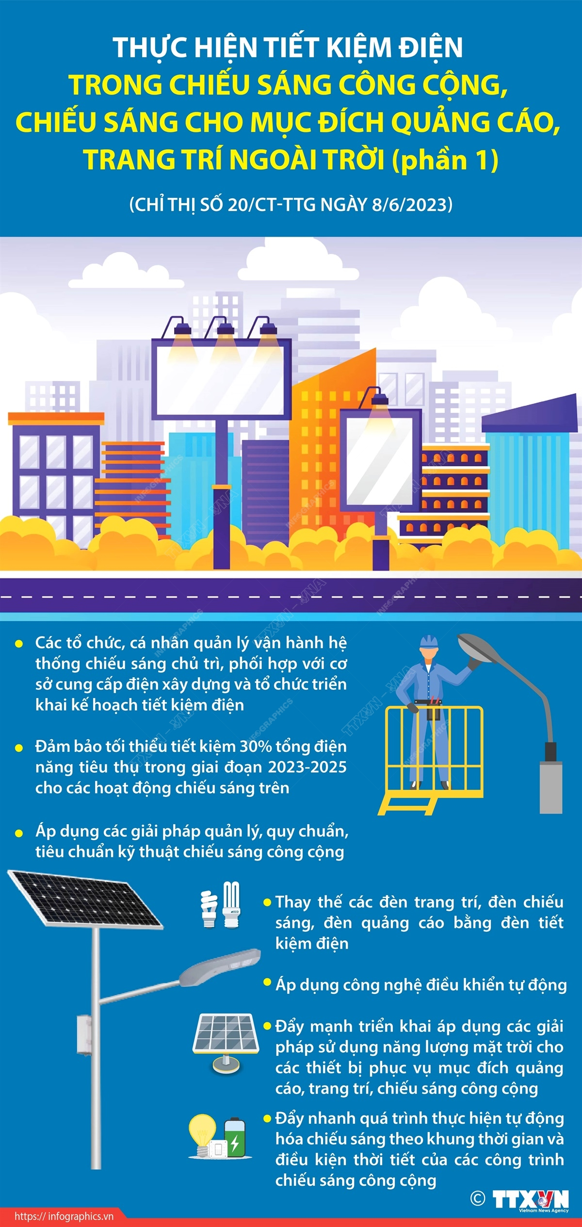 Ngày 8/6/2023, Thủ tướng Chính phủ đã ban hành Chỉ thị số 20/CT-TTg về việc tăng cường tiết kiệm điện giai đoạn 2023-2025 và các năm tiếp theo. Thủ tướng yêu cầu, thực hiện một số giải pháp sau để tiết kiệm điện trong chiếu sáng công cộng, chiếu sáng cho mục đích quảng cáo, trang trí ngoài trời.