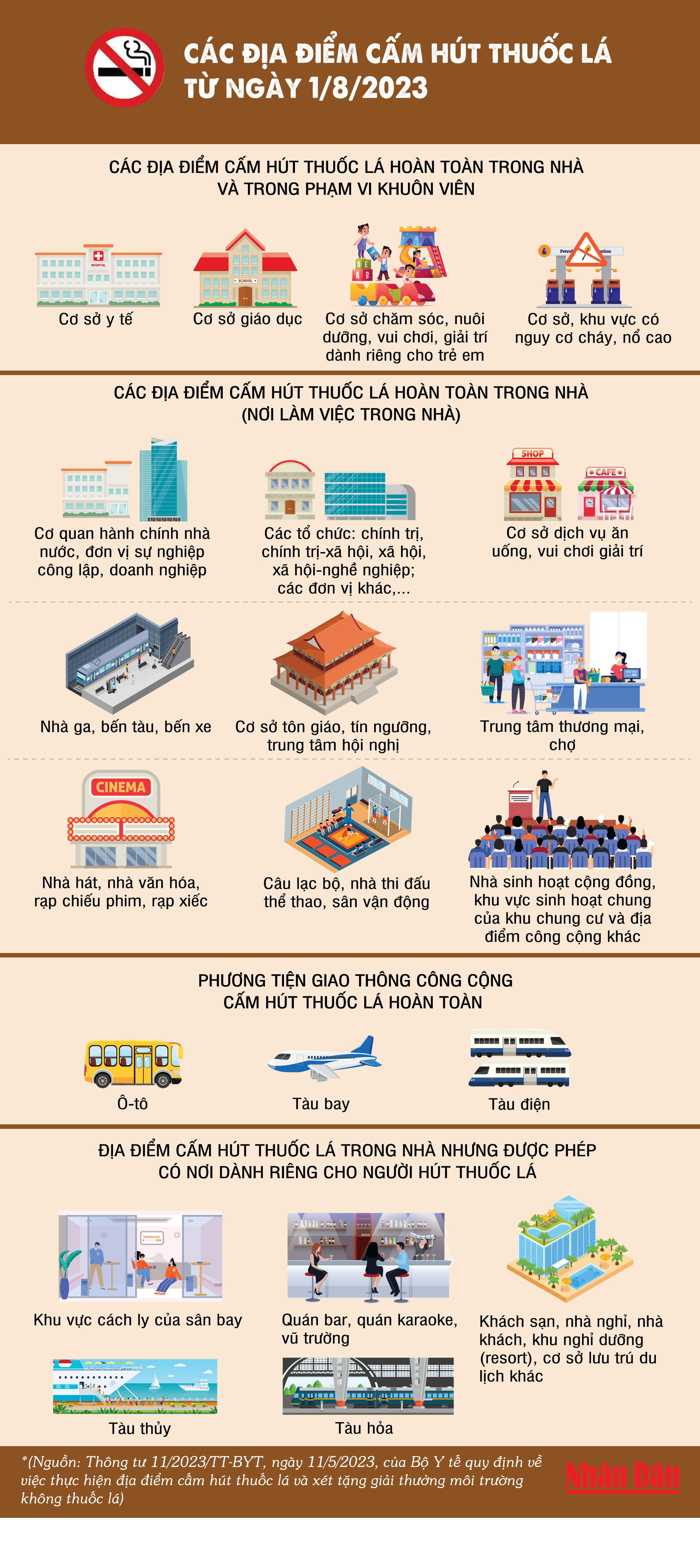 Bộ Y tế vừa ban hành Thông tư 11/2023/TT-BYT quy định về rõ các địa điểm cấm hút thuốc lá. Thông tư này có hiệu lực từ ngày 1/8/2023.