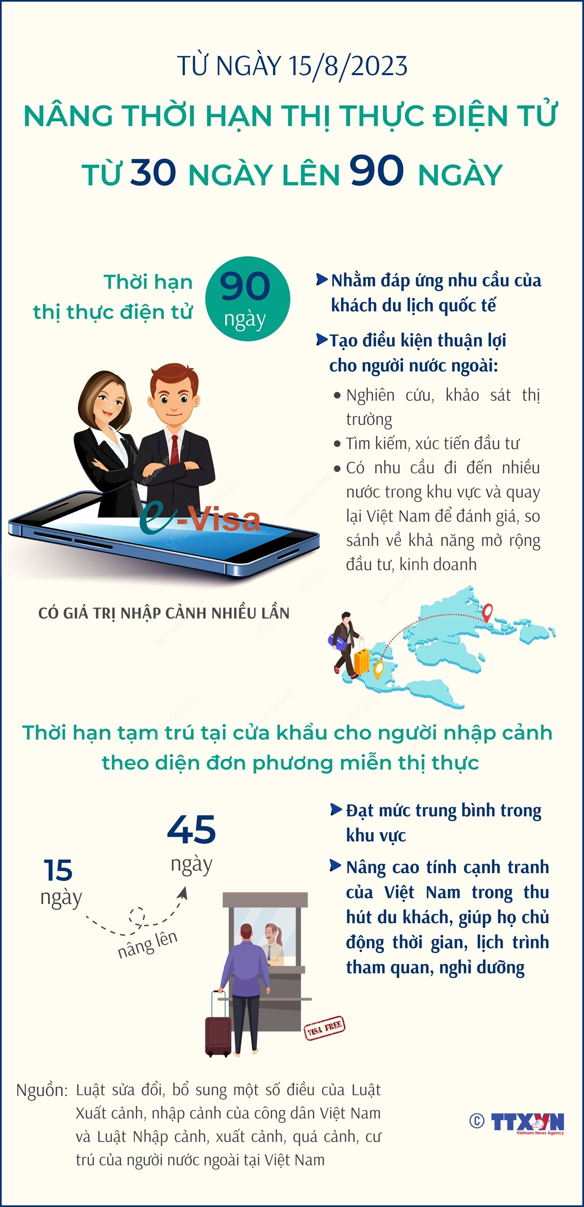 Luật sửa đổi, bổ sung một số điều của Luật Xuất cảnh, nhập cảnh của công dân Việt Nam và Luật Nhập cảnh, xuất cảnh, quá cảnh, cư trú của người nước ngoài tại Việt Nam vừa được Quốc hội thông qua. Theo đó, Luật nâng thời hạn của thị thực điện tử từ 30 ngày lên 90 ngày, có giá trị một lần hoặc nhiều lần. Đồng thời, Luật nâng thời hạn tạm trú từ 15 ngày lên 45 ngày đối với công dân của nước được Việt Nam đơn phương miễn thị thực và được xem xét giải quyết cấp thị thực, gia hạn tạm trú theo các quy định khác của Luật. Luật có hiệu lực thi hành từ ngày 15/8/2023.