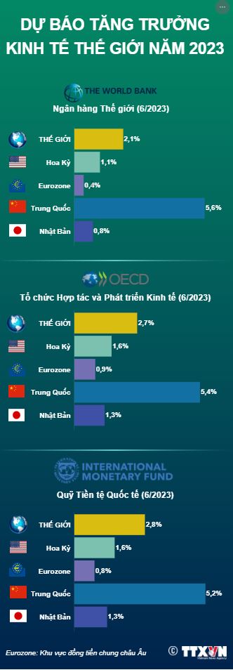 Đa số các tổ chức quốc tế dự báo tăng trưởng kinh tế toàn cầu năm 2023 tăng nhẹ so với dự báo từ đầu năm nhưng vẫn thấp hơn so với tốc độ tăng trưởng năm 2022. Ngân hàng Thế giới (WB) nhận định tăng trưởng toàn cầu sẽ chậm lại ở mức 2,1% trong năm 2023, điều chỉnh tăng 0,4 điểm phần trăm so với dự báo đầu năm 2023. Trong Báo cáo Triển vọng kinh tế tháng 6/2023, Tổ chức Hợp tác và Phát triển kinh tế (OECD) dự báo tăng trưởng kinh tế toàn cầu năm 2023 đạt 2,7%, tăng 0,1 điểm phần trăm so với dự báo trong tháng 3/2023. Quỹ Tiền tệ Quốc tế (IMF) dự báo tăng trưởng toàn cầu năm 2023 đạt 2,8%, thấp hơn 0,1 điểm phần trăm so với dự báo tháng 1/2023.