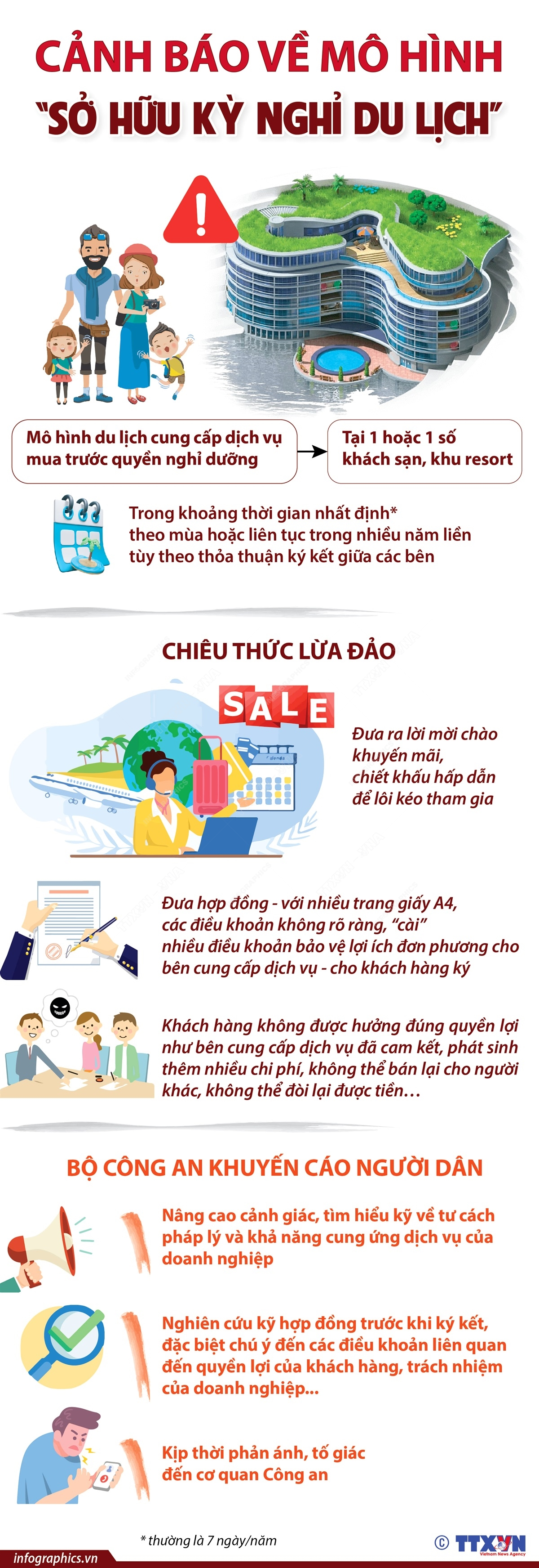 Bộ Công an đã phát đi thông tin cảnh báo về hoạt động mua bán “Sở hữu kỳ nghỉ du lịch” có nhiều chiêu thức để lừa đảo, trục lợi. Theo thông tin từ Bộ Công an, hoạt động mua bán “Sở hữu kỳ nghỉ du lịch” (Timeshare) đã xuất hiện từ lâu và phổ biến trên thế giới. Thời gian gần đây, mô hình này được triển khai tương đối phổ biến tại Việt Nam. Trong quá trình hoạt động, một số công ty đã đưa ra nhiều chiêu thức để mời chào khách hàng, lợi dụng lòng tin, sự thiếu hiểu biết, nhắm vào tâm lý thích được tặng quà…của người dân để lừa đảo, trục lợi.
