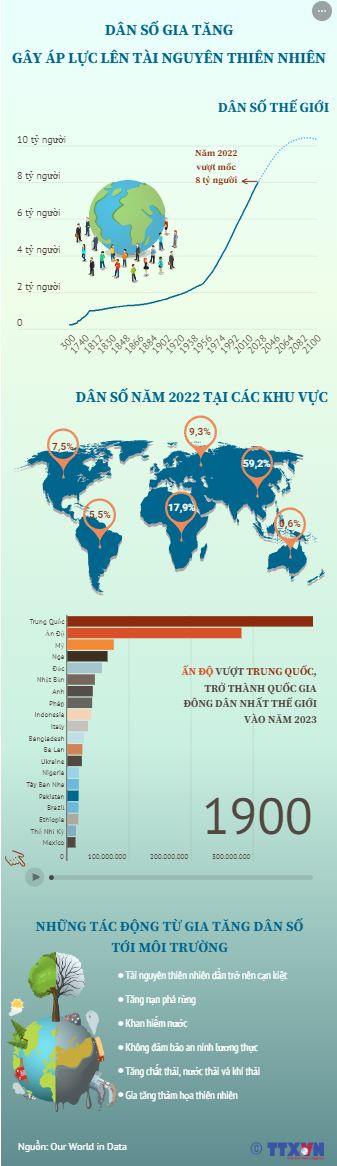 Kể từ giữa thế kỷ XX, thế giới đã trải qua sự gia tăng dân số chưa từng có. Dân số thế giới đã tăng hơn gấp ba lần trong giai đoạn từ năm 1950 đến năm 2020. Năm 2022 chứng kiến dấu mốc dân số đạt 8 tỷ người. Dân số gia tăng quá nhanh sẽ tác động nghiêm trọng đến môi trường. Trong khi dân số không ngừng biến động thì các nguồn tài nguyên thiên nhiên dần trở nên cạn kiệt và lượng khí thải ra môi trường ngày càng nhiều hơn.