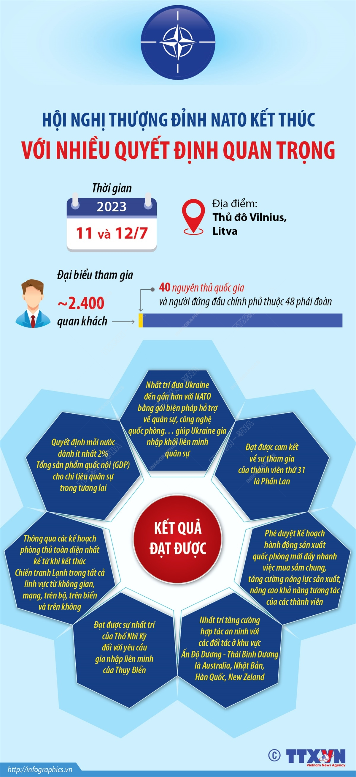 Kết thúc Hội nghị thượng đỉnh tại Vilnius (Litva) ngày 12/7/2023, Tổng thư ký Tổ chức Hiệp ước Bắc Đại Tây Dương (NATO) Jens Stoltenberg hoan nghênh việc các nhà lãnh đạo NATO đã đưa ra các quyết định quan trọng để điều chỉnh cơ chế hoạt động của liên minh cho tương lai. Các đồng minh đã nhất trí về các kế hoạch phòng thủ mạnh mẽ và chi tiết nhất của NATO kể từ Chiến tranh Lạnh, củng cố cam kết đầu tư quốc phòng, đồng ý đưa Ukraine đến gần NATO hơn và tăng cường quan hệ đối tác trên toàn thế giới.