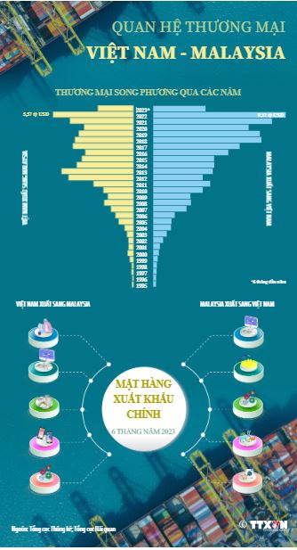 Những năm qua, quan hệ thương mại Việt Nam và Malaysia phát triển tốt đẹp, đặc biệt từ khi hai nước thiết lập quan hệ Đối tác Chiến lược vào tháng 8/2015. Năm 2022, thương mại song phương lập kỷ lục 14,7 tỷ USD. Tính riêng 6 tháng đầu năm 2023, trao đổi thương mại giữa hai nước đạt 6,07 tỷ USD, bằng 41,3% của cả năm 2022.
