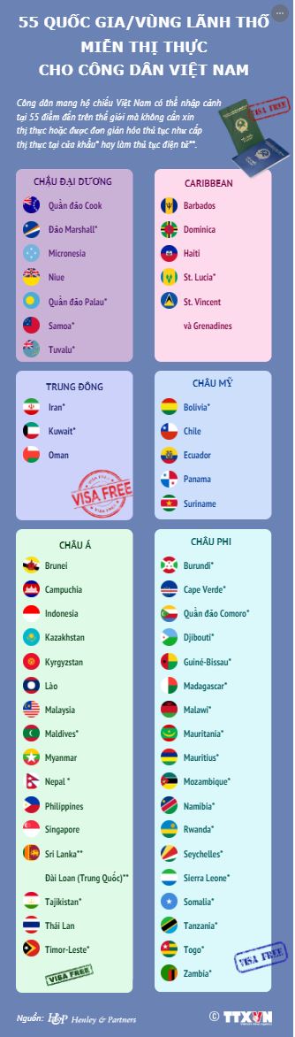 55 quốc gia/vùng lãnh thổ miễn thị thực cho công dân Việt Nam