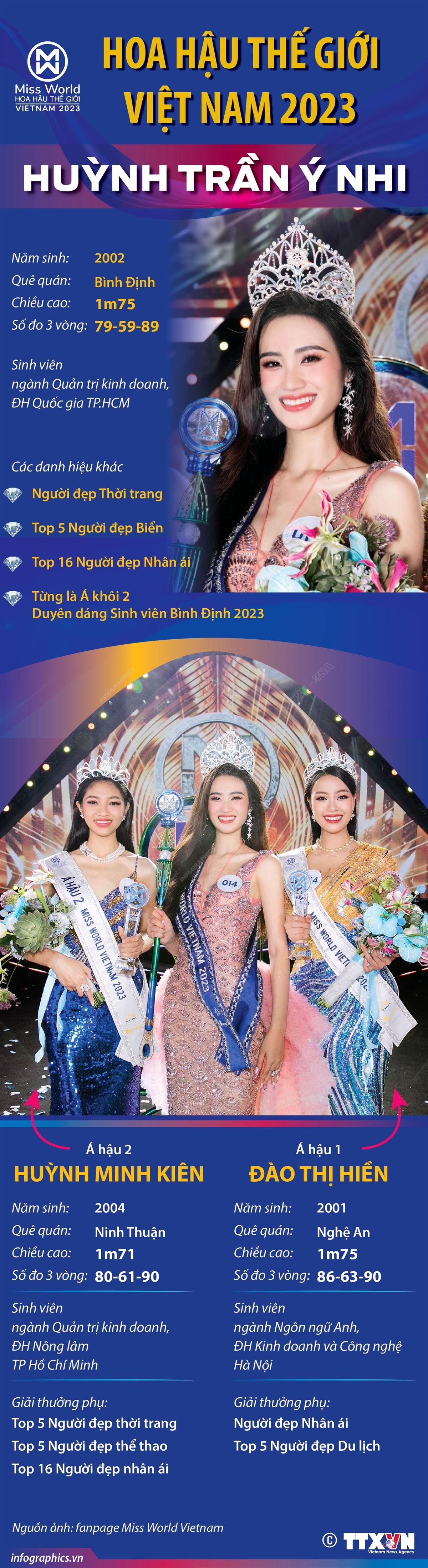 Ngôi vị cao quý nhất của Hoa hậu Thế giới Việt Nam (Miss World Vietnam) 2023 đã thuộc về người đẹp Huỳnh Trần Ý Nhi đến từ Bình Định. Á hậu 1 và á hậu 2 lần lượt thuộc về Đào Thị Hiền và Huỳnh Minh Kiên.