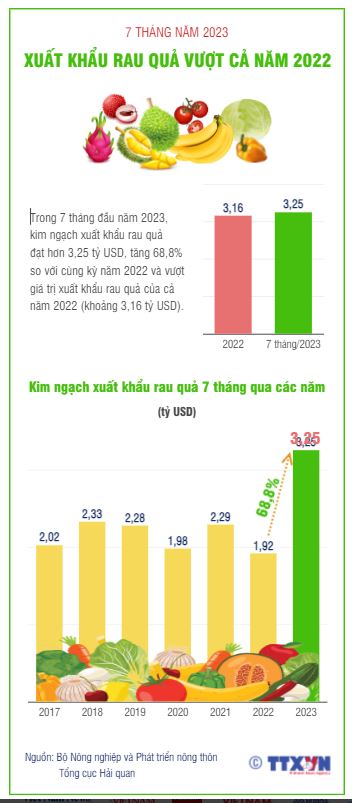 Trong 7 tháng đầu năm 2023, xuất khẩu rau quả cả nước đạt hơn 3,25 tỷ USD, tăng 68,8% so với cùng kỳ năm 2022 và vượt giá trị xuất khẩu rau quả khoảng 3,16 tỷ USD của cả năm 2022.
