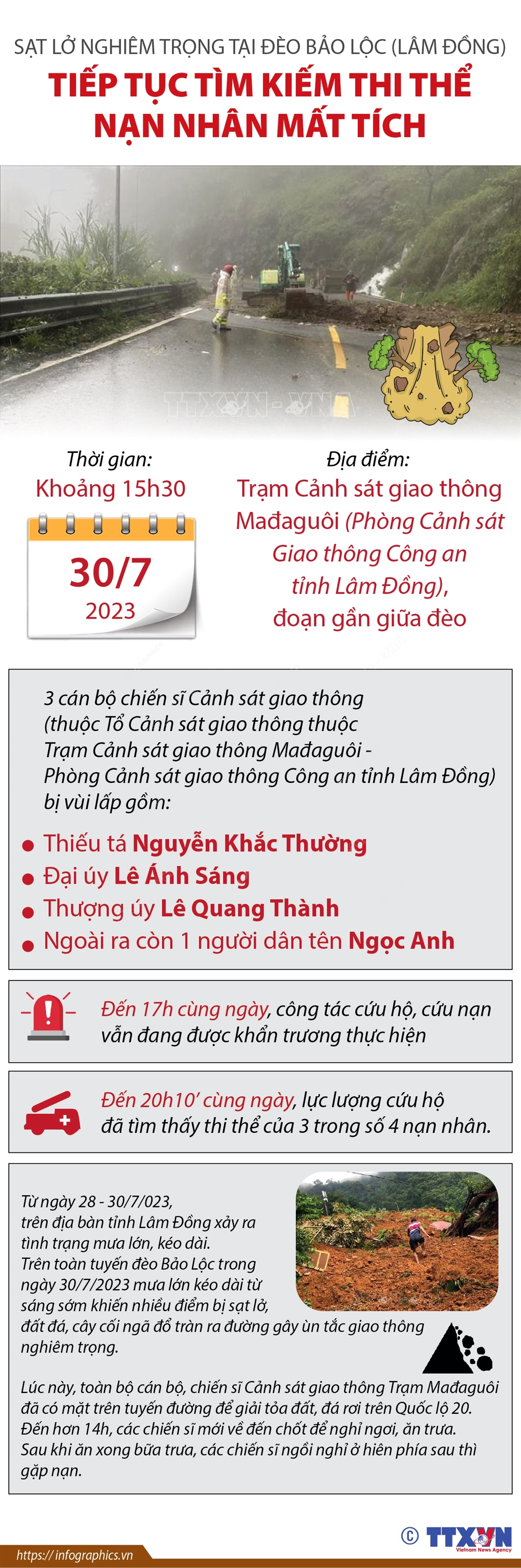 Đến sáng 31/7/2023, đèo Bảo Lộc vẫn bị phong tỏa, chưa thể lưu thông. Các ngành chức năng, chính quyền địa phương đang tập trung khắc phục hậu quả thiên tai tại những khu vực bị ảnh hưởng. Tính đến khoảng 22 giờ ngày 30/7, lực lượng cứu hộ đã tìm thấy thi thể của 3 nạn nhân bị vùi lấp tại Chốt Cảnh sát Giao thông trên đèo Bảo Lộc là ba cán bộ, chiến sĩ Công an và đang tiếp tục tìm kiếm nạn nhân còn lại.