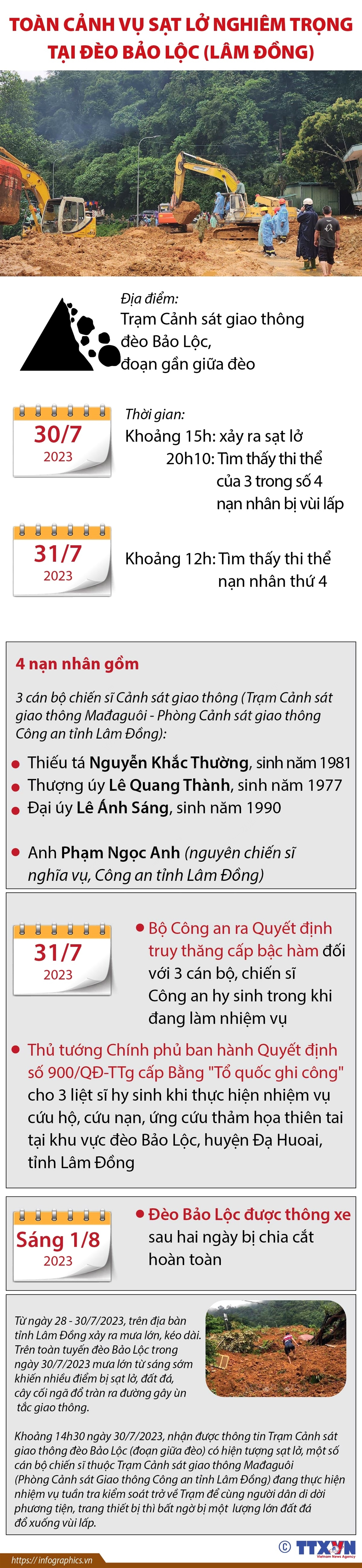Vụ sạt lở đất xảy ra tại Trạm Cảnh sát giao thông đèo Bảo Lộc, huyện Đạ Huoai, tỉnh Lâm Đồng ngày 30/7/2023 đã làm 4 người thiệt mạng, trong đó có 3 cán bộ chiến sĩ Cảnh sát giao thông của Phòng Cảnh sát giao thông Công an tỉnh Lâm Đồng. Ngày 31/7/2023, Thủ tướng Chính phủ đã ban hành Quyết định số 900/QĐ-TTg cấp Bằng "Tổ quốc ghi công" cho 3 liệt sĩ hy sinh khi thực hiện nhiệm vụ cứu hộ, cứu nạn, ứng cứu thảm họa thiên tai tại khu vực đèo Bảo Lộc, huyện Đạ Huoai, tỉnh Lâm Đồng. Bộ Công an cũng ra Quyết định truy thăng cấp bậc hàm đối với 3 cán bộ, chiến sĩ Công an hy sinh trong khi đang làm nhiệm vụ trên đèo Bảo Lộc, tỉnh Lâm Đồng.
