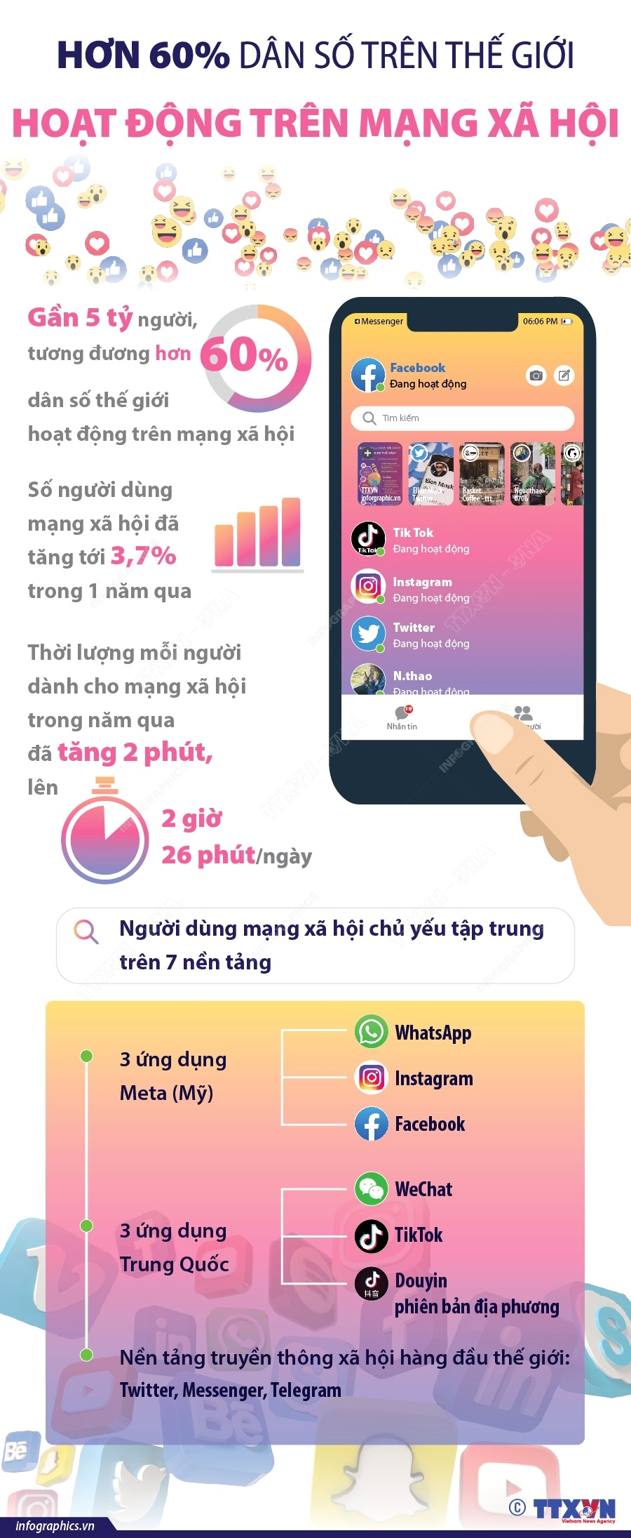 Gần 5 tỷ người, tương đương hơn 60% dân số thế giới, hoạt động trên mạng xã hội, theo báo cáo hằng quý công bố tháng 7/2023 của công ty tư vấn kỹ thuật số Kepios.