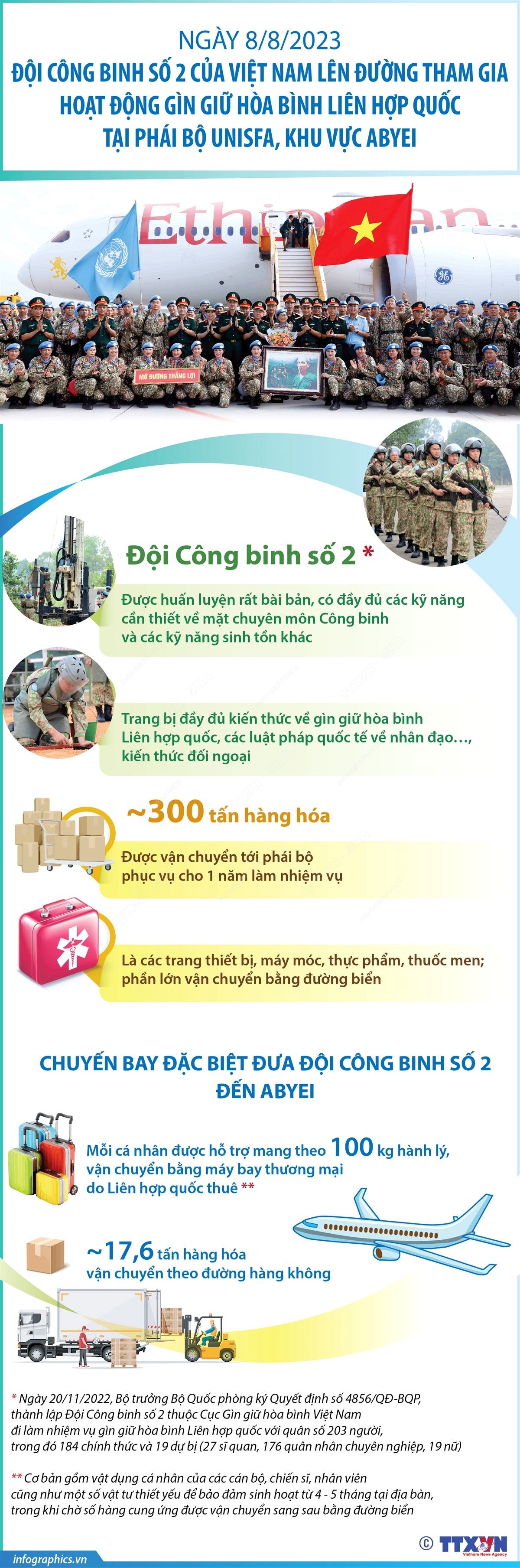Sáng 8/8/2023, Bộ Quốc phòng tổ chức Lễ tiễn Đội Công binh số 2 lên đường thực hiện nhiệm vụ gìn giữ hòa bình Liên hợp quốc tại phái bộ UNISFA, khu vực Abyei. Các thành viên Đội Công binh số 2 đã được huấn luyện rất bài bản, có đầy đủ các kỹ năng cần thiết về mặt chuyên môn Công binh và các kỹ năng sinh tồn khác, hội tụ đầy đủ các yếu tố để sẵn sàng triển khai nhiệm vụ tại địa bàn và bảo đảm hoàn thành xuất sắc nhiệm vụ được giao.
