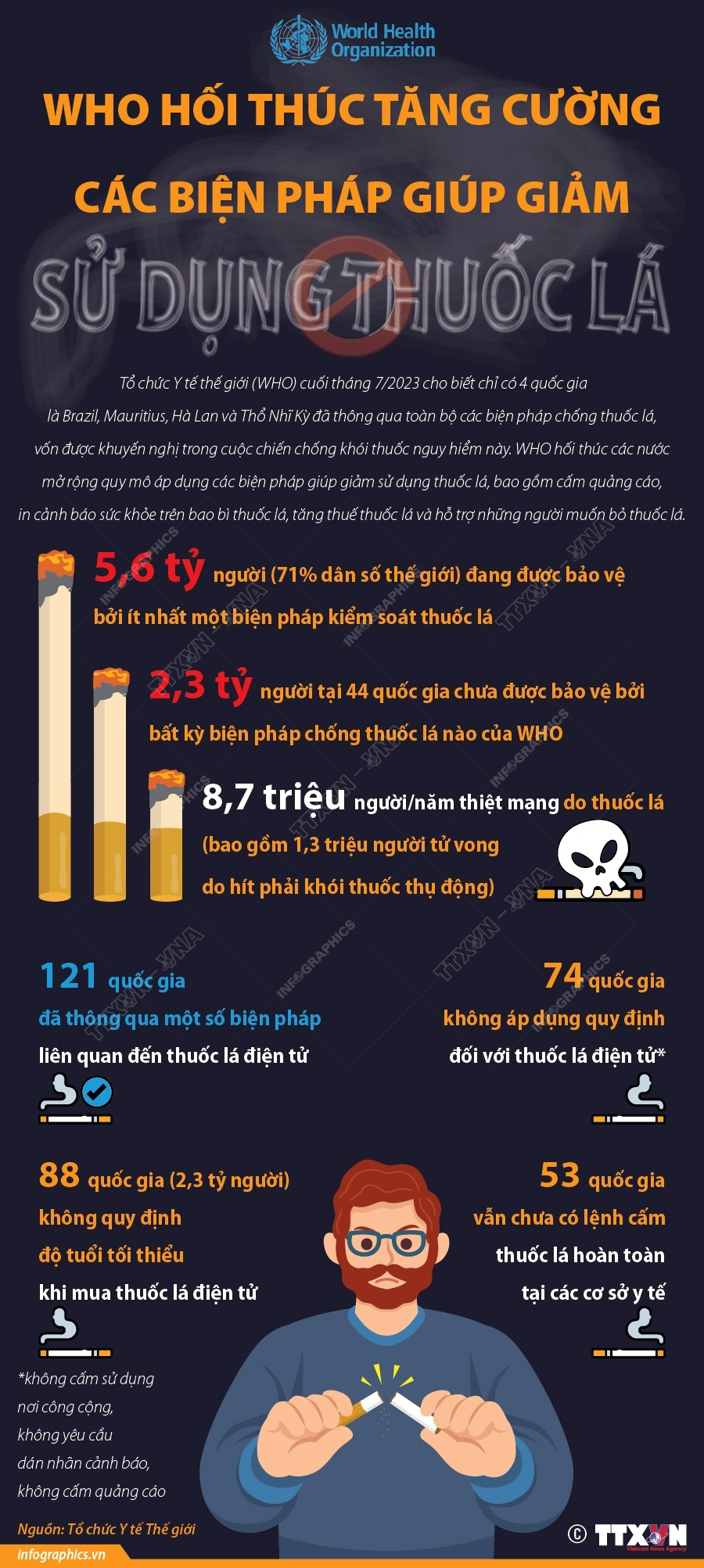 Tổ chức Y tế thế giới (WHO) cuối tháng 7/2023 cho biết chỉ có 4 quốc gia là Brazil, Mauritius, Hà Lan và Thổ Nhĩ Kỳ đã thông qua toàn bộ các biện pháp chống thuốc lá, vốn được khuyến nghị trong cuộc chiến chống khói thuốc nguy hiểm này. WHO hối thúc các nước mở rộng quy mô áp dụng các biện pháp giúp giảm sử dụng thuốc lá, bao gồm cấm quảng cáo, in cảnh báo sức khỏe trên bao bì thuốc lá, tăng thuế thuốc lá và hỗ trợ những người muốn bỏ thuốc lá.