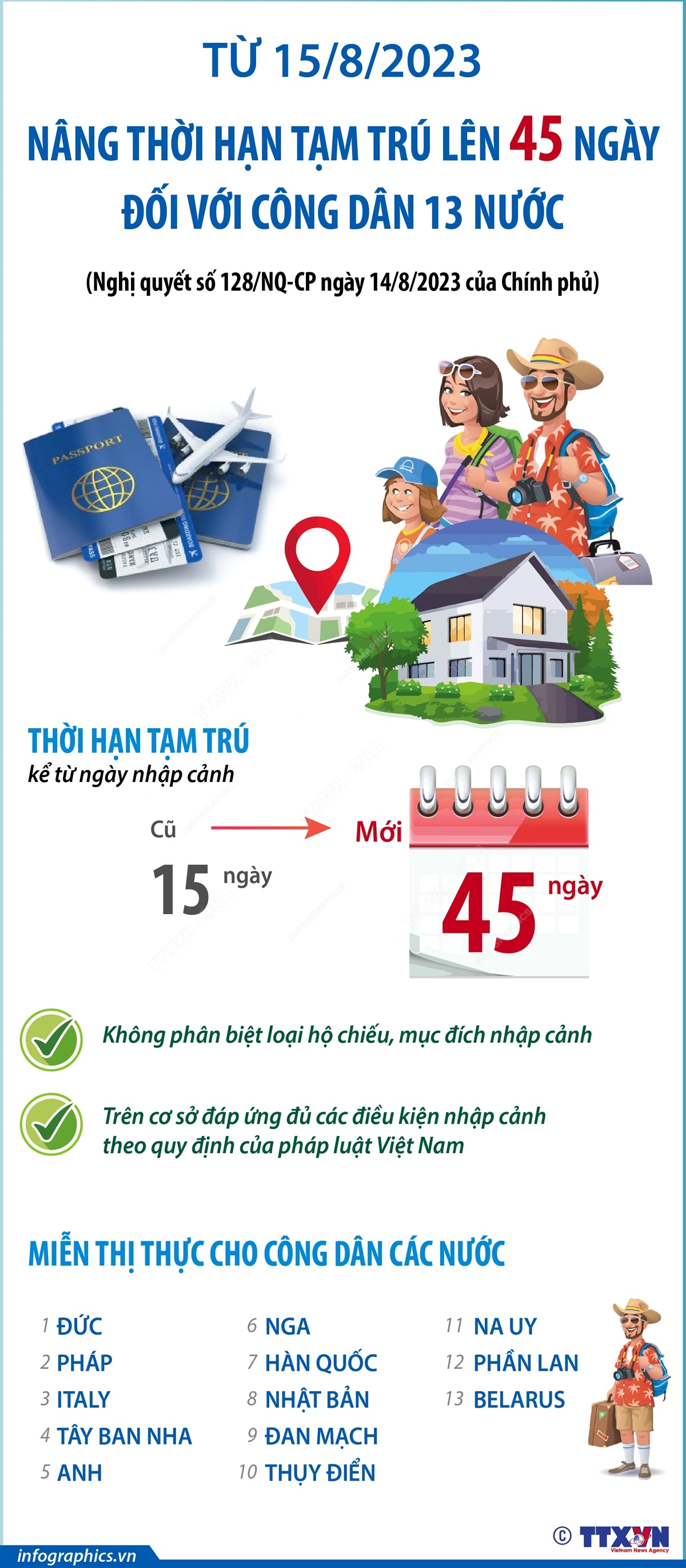 Theo Nghị quyết số 128/NQ-CP ngày 14/8/2023 của Chính phủ, từ 15/8/2023, thời hạn tạm trú đối với công dân các nước Đức, Pháp, Italy, Tây Ban Nha, Anh, Nga, Hàn Quốc, Nhật Bản, Đan Mạch, Thụy Điển, Na Uy, Phần Lan, Belarus tại Việt Nam được nâng từ 15 ngày lên 45 ngày.