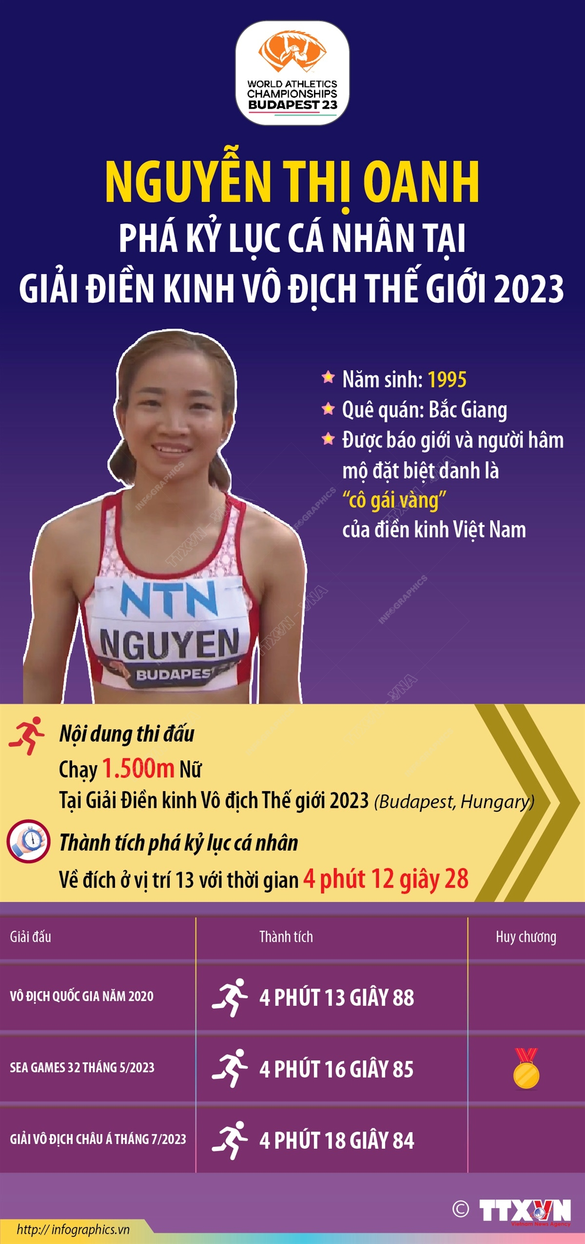 Tối 19/8/2023, vận động viên Nguyễn Thị Oanh đã bước vào tranh tài ở vòng loại Nữ 1.500m tại Giải Điền kinh Vô địch Thế giới 2023 ở Budapest, Hungary. Về đích với thành tích 4 phút 12 giây 28, Nguyễn Thị Oanh đã lập kỷ lục cá nhân mới trên đường chạy 1.500m. Tuy nhiên thành tích trên là không đủ để cô đoạt vé đi tiếp.