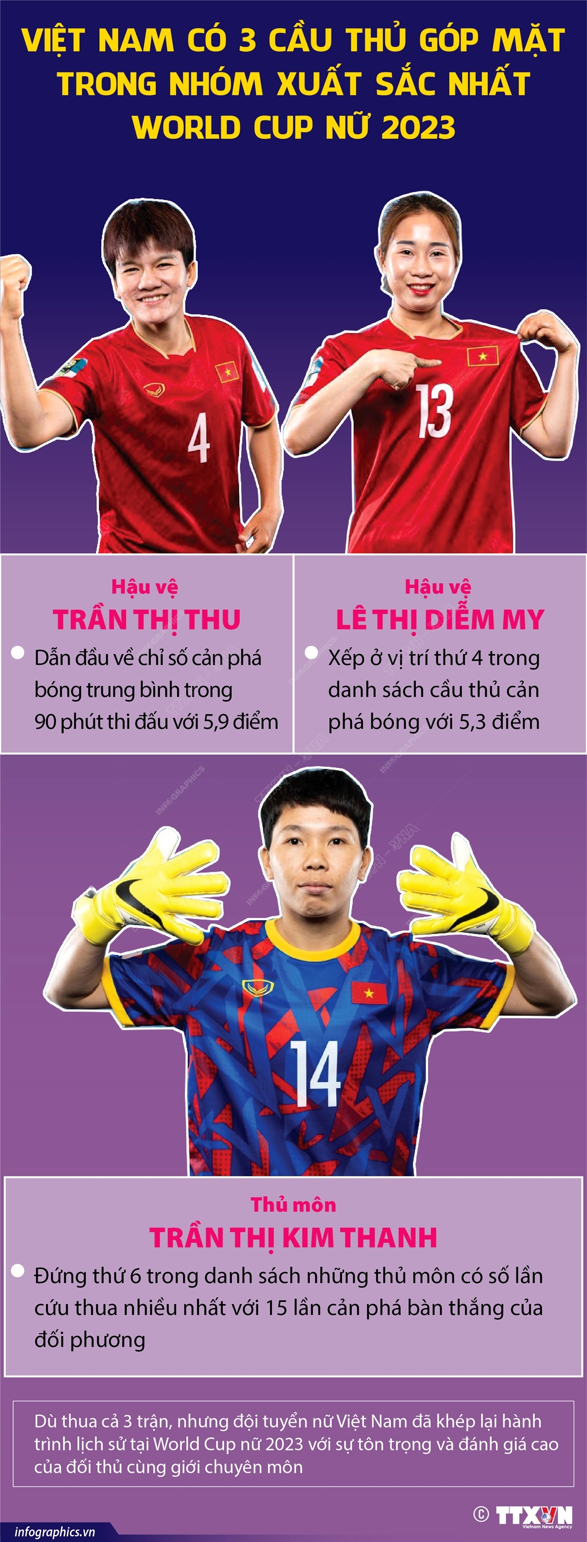 Liên đoàn Bóng đá Thế giới (FIFA) ngày 23/8/2023 đã công bố các nhóm cầu thủ xuất sắc nhất theo từng vị trí trong đội hình các đội tuyển tham dự World Cup nữ 2023. Ba thành viên của đội tuyển nữ Việt Nam là Trần Thị Kim Thanh, Trần Thị Thu và Lê Thị Diễm My đã góp mặt trong nhóm các cầu thủ này.