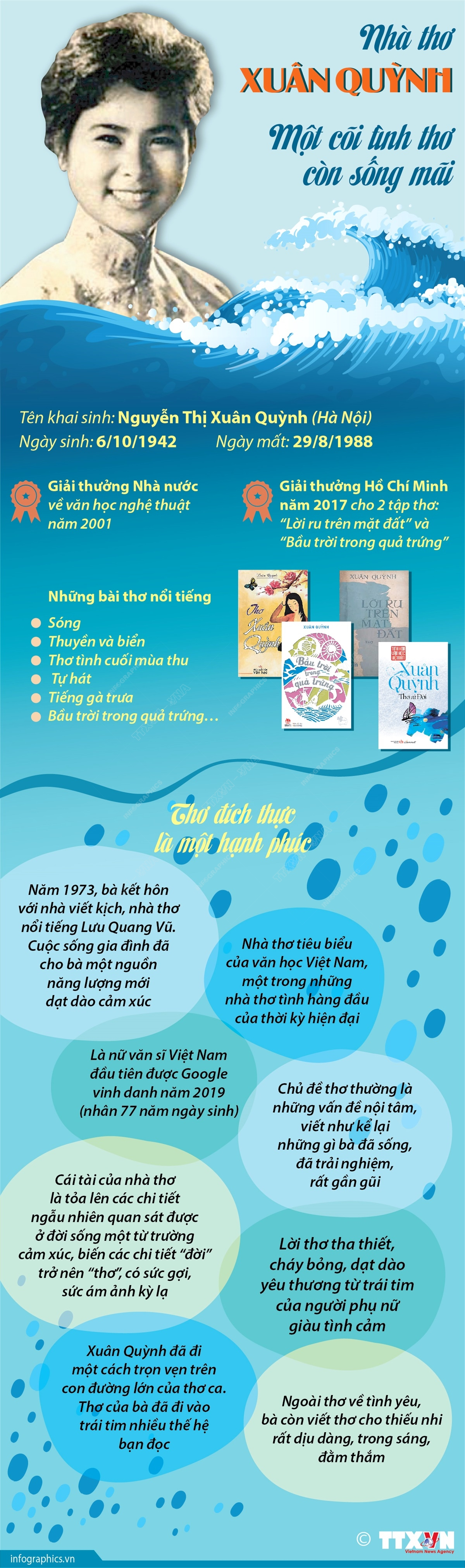 Xuân Quỳnh là nhà thơ tiêu biểu của văn học Việt Nam với những vần thơ gắn liền với dòng chảy văn nghệ và đời sống tinh thần của nhiều thế hệ, là một trong những nhà thơ tình hàng đầu của thời kỳ hiện đại. Trong cuộc đời ngắn ngủi của mình, Xuân Quỳnh đã đi một cách trọn vẹn trên con đường lớn của thơ ca. Nhà thơ Xuân Quỳnh cùng chồng là nhà biên kịch nổi tiếng Lưu Quang Vũ và con trai Lưu Quỳnh Thơ mất trong một vụ tai nạn giao thông ngày 29/8/1988, cách đây 35 năm.