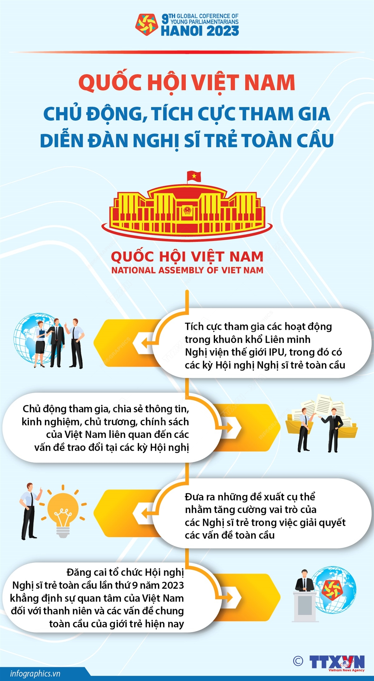 Thời gian qua, Quốc hội Việt Nam đã tích cực tham gia các hoạt động trong khuôn khổ Liên minh nghị viện thế giới IPU, trong đó có các kỳ Hội nghị Nghị sĩ trẻ toàn cầu. Tại các Hội nghị này, Đoàn Việt Nam đã chủ động, tích cực tham gia, chia sẻ thông tin, kinh nghiệm, chủ trương, chính sách của Việt Nam liên quan đến các vấn đề trao đổi tại Hội nghị đồng thời, đưa ra những đề xuất cụ thể nhằm tăng cường vai trò của các Nghị sĩ trẻ trong việc giải quyết các vấn đề toàn cầu.