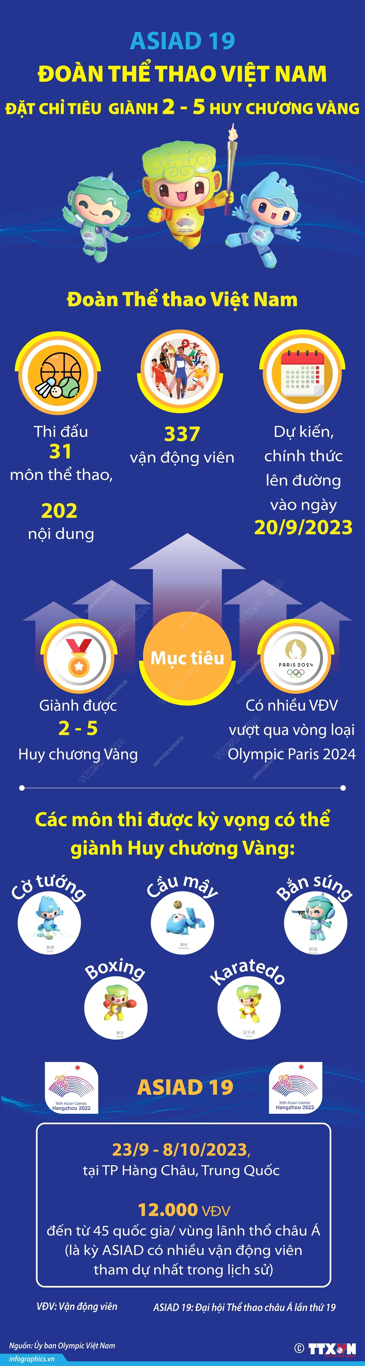 Đoàn thể thao Việt Nam tham dự Đại hội Thể thao châu Á lần thứ 19 (ASIAD 19) với 504 thành viên, trong đó có 337 vận động viên, thi đấu 31/40 môn thể thao, 202/483 nội dung của Đại hội. Đoàn phấn đấu đạt từ 2 đến 5 Huy chương Vàng, đồng thời có nhiều vận động viên vượt qua vòng loại Olympic 2024. Đoàn dự kiến lên đường tham dự ASIAD 19 vào ngày 20/9/2023.