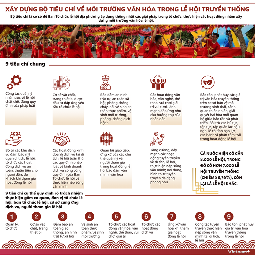 Với gần 8.000 lễ hội trên cả nước, Bộ tiêu chí là cơ sở để ban tổ chức các địa phương áp dụng thống nhất các giải pháp, tôn vinh các giá trị văn hóa một cách lành mạnh, an toàn và hiệu quả.