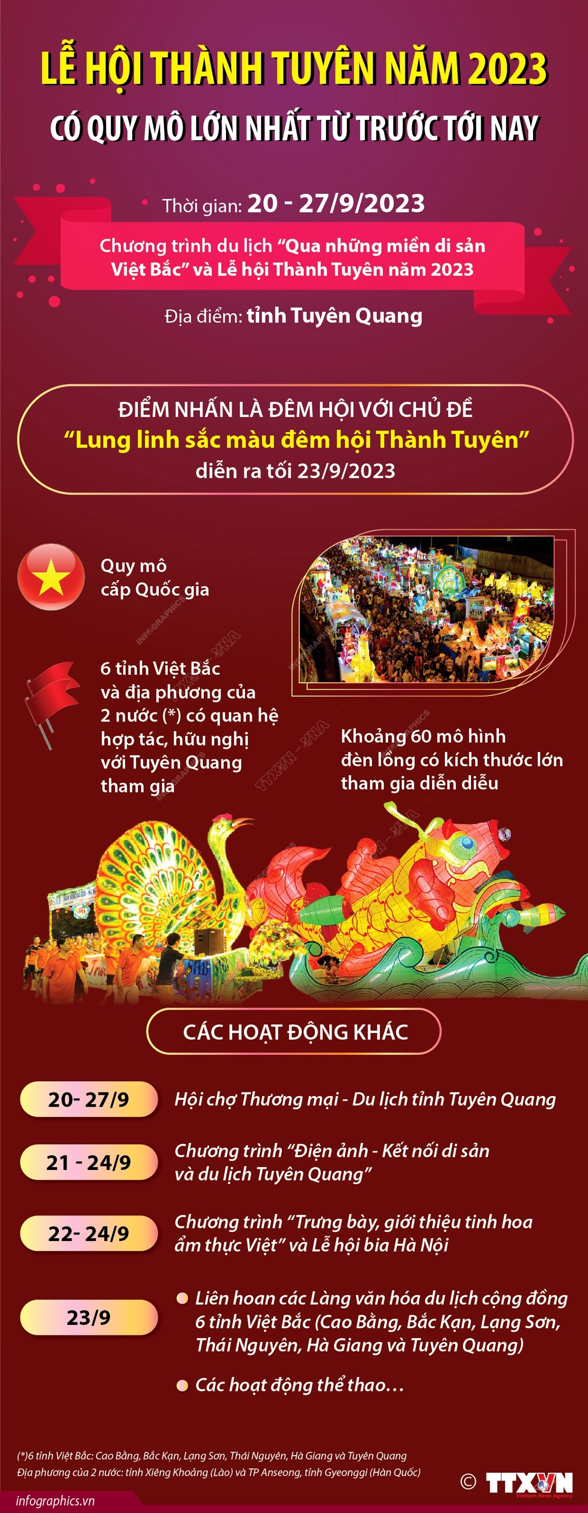 Chương trình du lịch “Qua những miền di sản Việt Bắc” lần thứ XIV và Lễ hội Thành Tuyên năm 2023 được tổ chức trong 8 ngày từ 20 - 27/9/2023. Trong khuôn khổ Chương trình, nhiều hoạt động đặc sắc được tổ chức như: Liên hoan các Làng văn hóa du lịch cộng đồng 6 tỉnh Việt Bắc; Chương trình “Điện ảnh - Kết nối di sản và du lịch Tuyên Quang”; hội chợ Thương mại - Du lịch tỉnh Tuyên Quang năm 2023; Chương trình “Trưng bày, giới thiệu tinh hoa ẩm thực Việt” và Lễ hội bia Hà Nội năm 2023; các hoạt động thể thao cùng nhiều hoạt động hưởng ứng của các huyện, thành phố trong tỉnh...