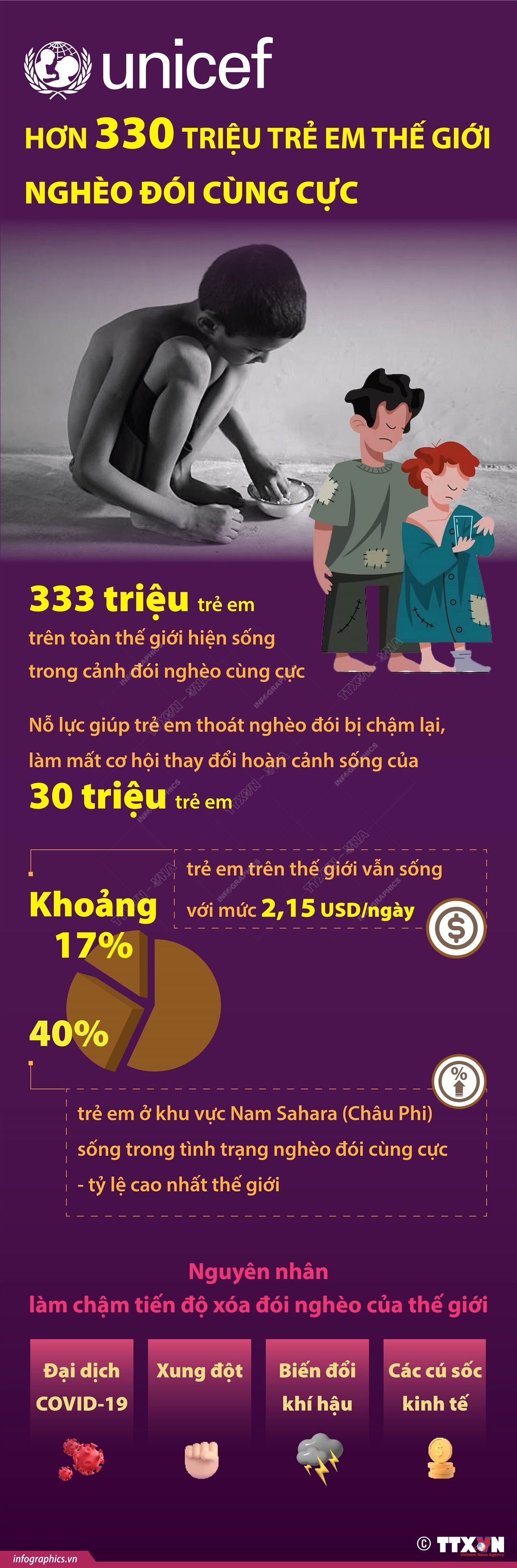 Theo Quỹ Nhi đồng Liên hợp quốc (UNICEF) và Ngân hàng Thế giới (WB) ngày 13/9/2023, đại dịch COVID-19 đã làm chậm tiến độ hỗ trợ trẻ em thoát nghèo, với 333 triệu trẻ trên toàn thế giới hiện vẫn sống trong cảnh đói nghèo cùng cực.