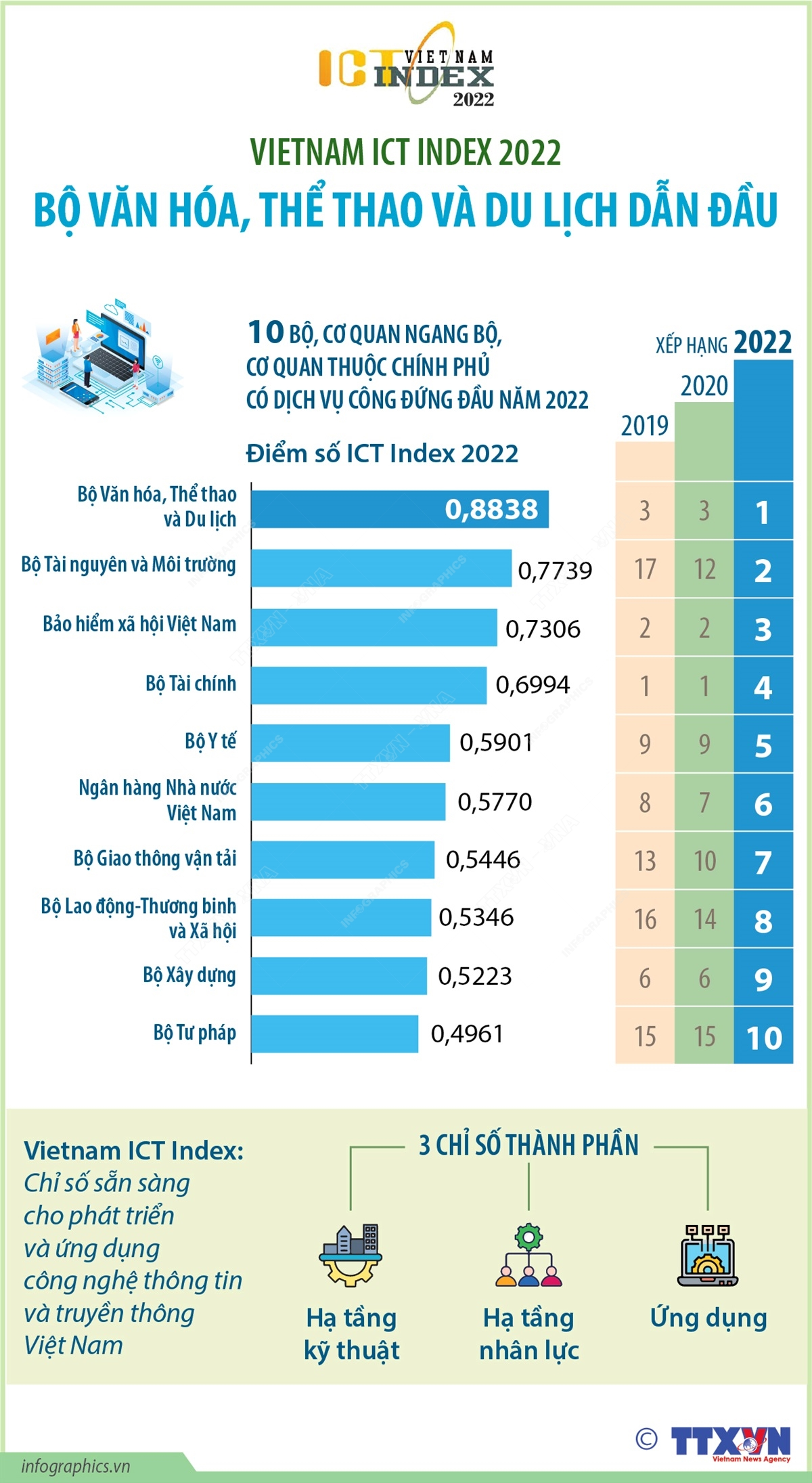 Theo báo cáo Chỉ số sẵn sàng cho phát triển và ứng dụng công nghệ thông tin và truyền thông Việt Nam (Vietnam ICT Index) năm 2022, Bộ Văn hóa,Thể thao và Du lịch dẫn đầu xếp hạng chung năm nay với số điểm ICT Index là 0,8838. Sapo ngoài