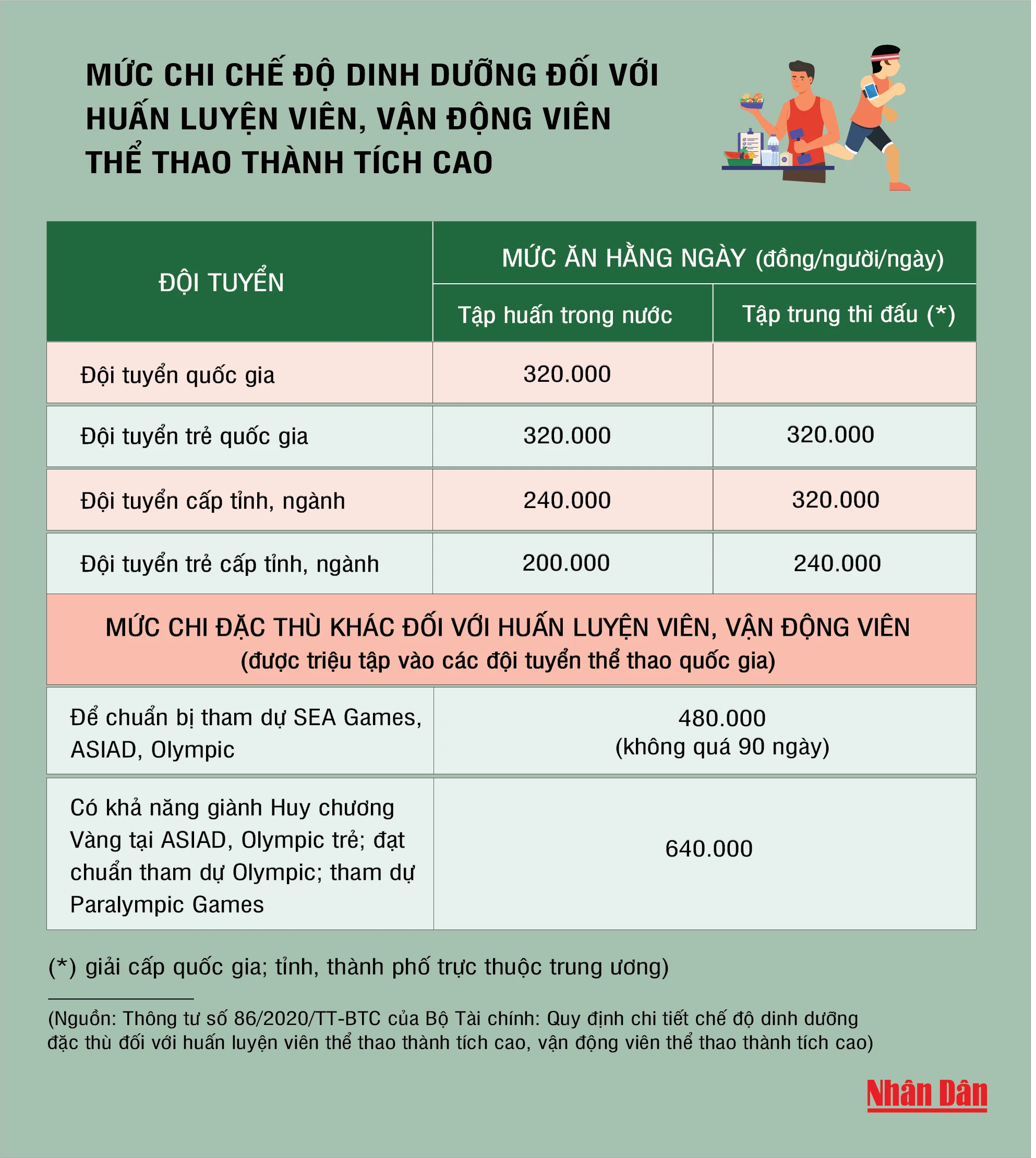 Thông tư số 86/2020/TT-BTC của Bộ Tài chính quy định chi tiết chế độ dinh dưỡng đặc thù đối với huấn luyện viên thể thao thành tích cao, vận động viên thể thao thành tích cao.