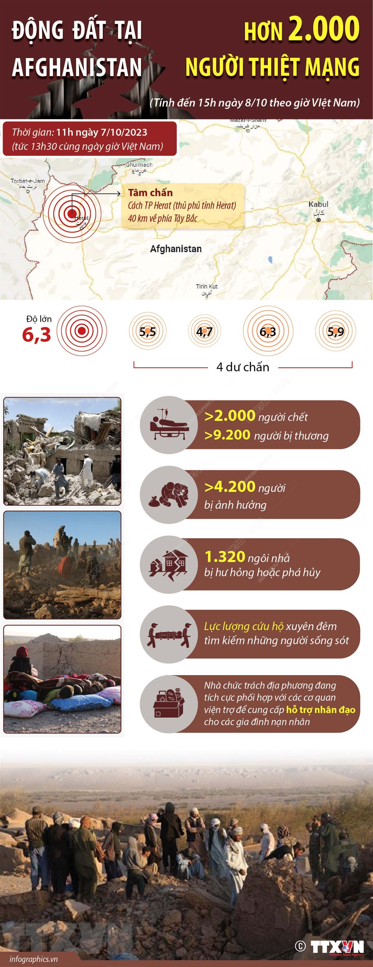 Ngày 8/10/2023, một người phát ngôn của chính quyền Taliban ở Afghanistan cho biết số người thiệt mạng trong các trận động đất rung chuyển miền Tây nước này ngày 7/10 đã tăng lên hơn 2.000 người, trong khi số người bị thương tăng lên hơn 9.200 người. Đây là trận động đất gây thương vong nặng nề nhất ở Afghanistan trong hơn 2 thập kỷ qua.