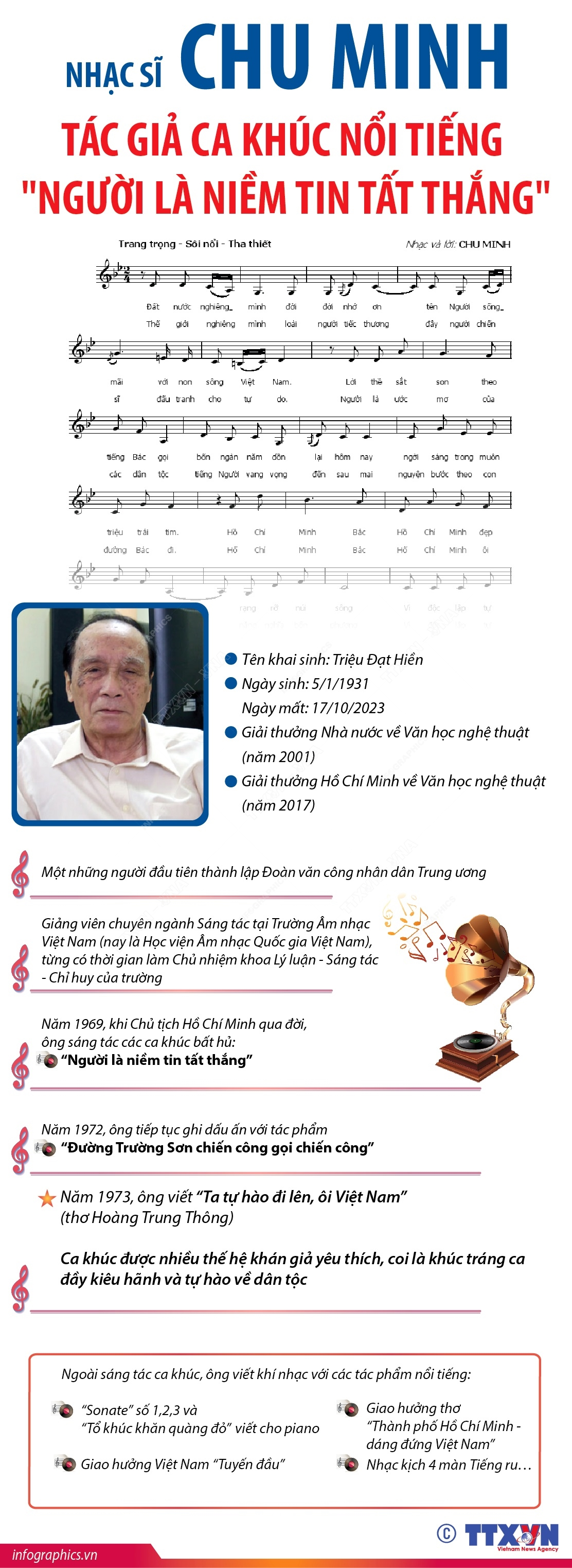 Nhạc sĩ Chu Minh, tác giả ca khúc "Người là niềm tin tất thắng", "Ta tự hào đi lên, ôi Việt Nam" đã từ trần sáng 17/10/2023 tại Hà Nội, hưởng thọ 92 tuổi. Ông là nhạc sĩ tài năng của nền âm nhạc cách mạng. Hai ca khúc “Người là niềm tin tất thắng” và “Ta tự hào đi lên, ôi Việt Nam” của ông đã trở thành các tác phẩm lớn trong nền âm nhạc cách mạng Việt Nam.