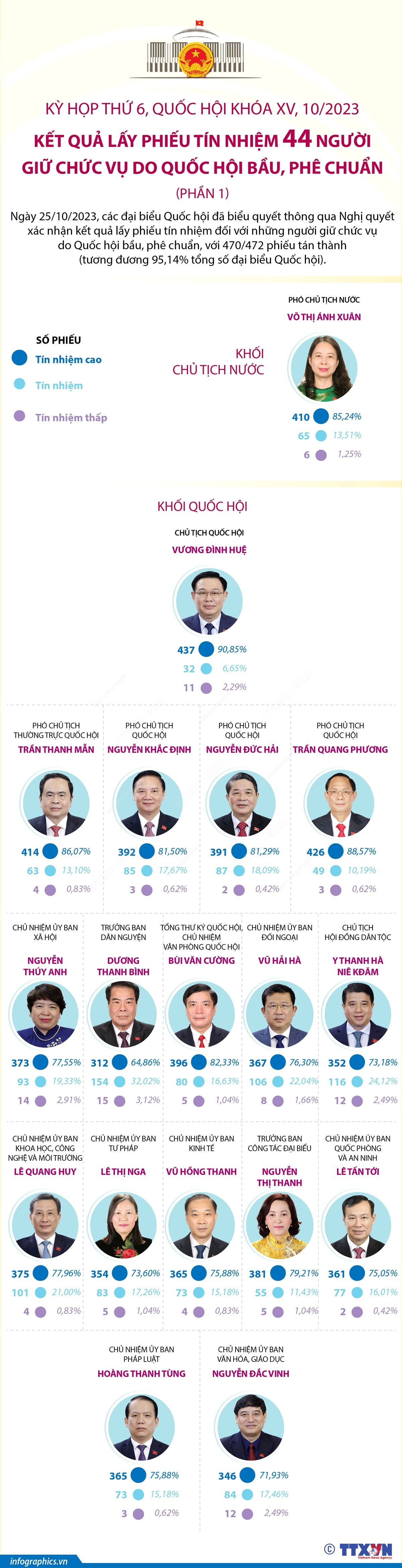 Chiều 25/10/2023, các đại biểu Quốc hội đã biểu quyết thông qua Nghị quyết xác nhận kết quả lấy phiếu tín nhiệm đối với những người giữ chức vụ do Quốc hội bầu, phê chuẩn, với 470/472 phiếu tán thành (tương đương 95,14% tổng số đại biểu Quốc hội). Trước đó, chiều cùng ngày, Ban Kiểm phiếu báo cáo kết quả kiểm phiếu. Kết quả các chức danh Quốc hội lấy phiếu tín nhiệm cụ thể như sau:
