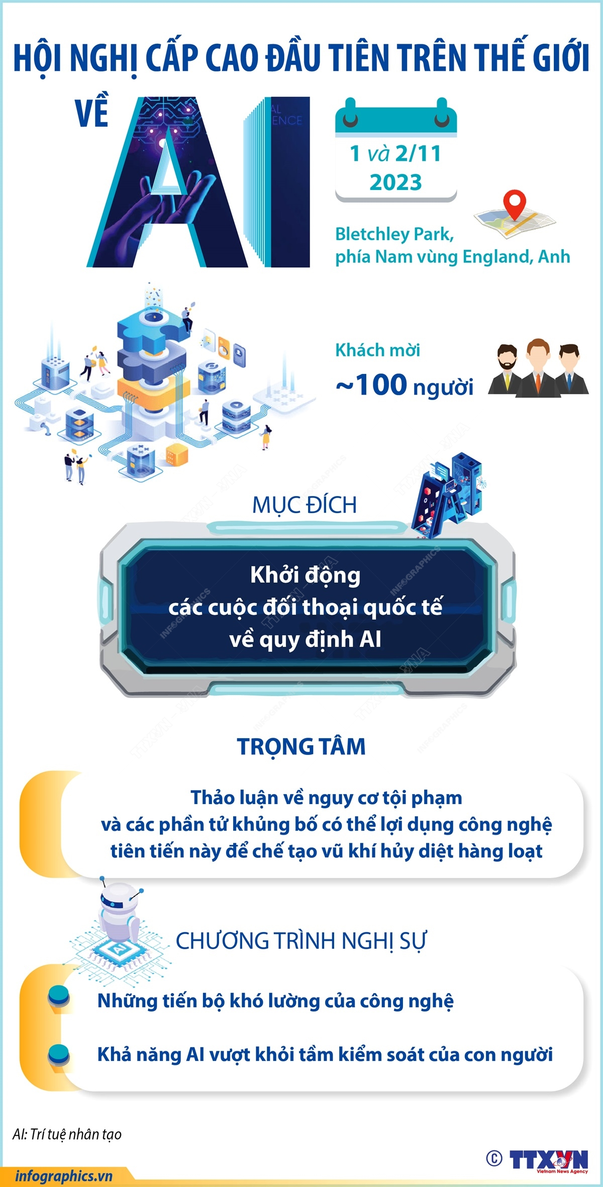 Với mục tiêu trở thành nước đi đầu thế giới trong lĩnh vực công nghệ trí tuệ nhân tạo (AI), Anh sẽ đăng cai Hội nghị cấp cao đầu tiên về an toàn AI trong 2 ngày 1-2/11/2023. Hội nghị đặt trọng tâm thảo luận về nguy cơ tội phạm và các phần tử khủng bố có thể lợi dụng công nghệ tiên tiến này để chế tạo vũ khí hủy diệt hàng loạt.