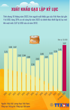 Tính chung 10 tháng năm 2023, kim ngạch xuất khẩu gạo của Việt Nam đạt gần 4 tỷ USD, tăng 35% so với cùng kỳ năm 2022 và chính thức thiết lập kỷ lục mới khi vượt mốc 3,67 tỷ USD của cả năm 2012.
