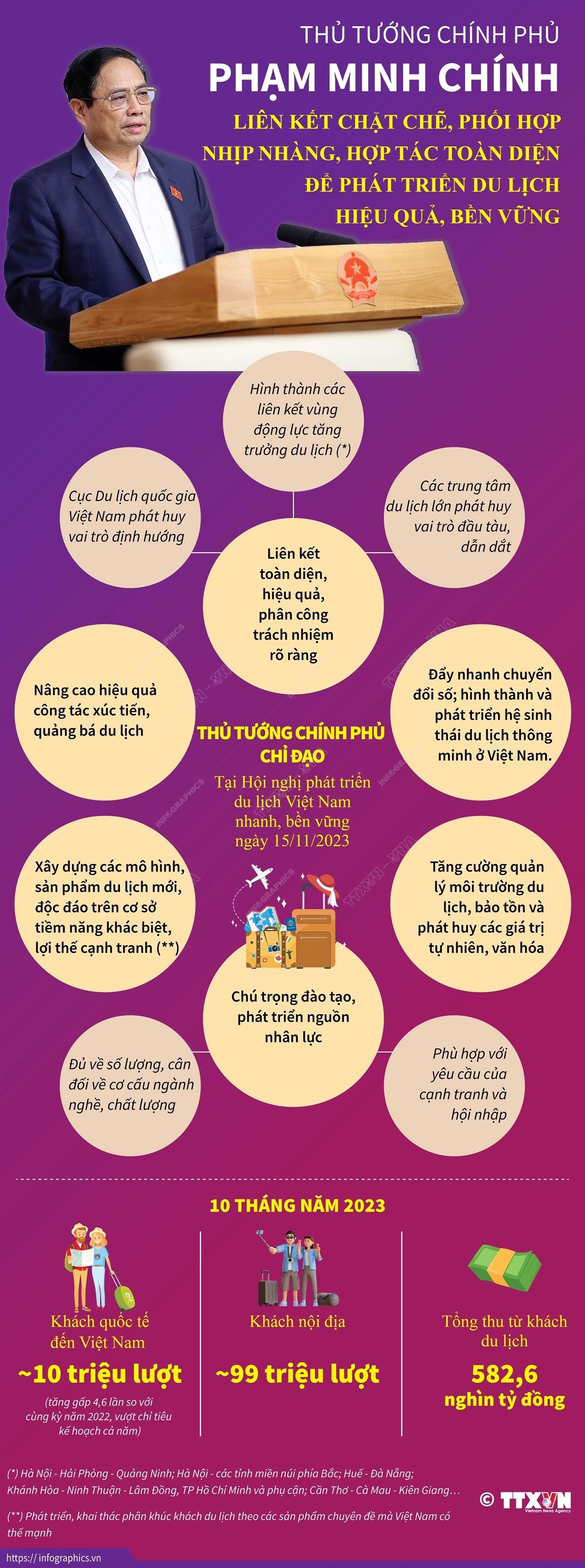 Thủ tướng Chính phủ Phạm Minh Chính nhấn mạnh một số nhiệm vụ, giải pháp trong thời gian tới để phát triển du lịch Việt Nam hiệu quả, bền vững tại Hội nghị toàn quốc về du lịch năm 2023 diễn ra ngày 15/11/2023. Đó là: Thực hiện liên kết toàn diện, hiệu quả, phân công trách nhiệm rõ ràng giữa các bộ, ngành, địa phương, doanh nghiệp…; Chú trọng đào tạo, phát triển nguồn nhân lực du lịch, bảo đảm đủ về số lượng, cân đối về cơ cấu ngành nghề và chất lượng, phù hợp với yêu cầu của cạnh tranh và hội nhập; Xây dựng các mô hình, sản phẩm du lịch mới, độc đáo trên cơ sở tiềm năng khác biệt, lợi thế cạnh tranh; Đẩy nhanh chuyển đổi số, hình thành và phát triển hệ sinh thái du lịch thông minh ở Việt Nam…