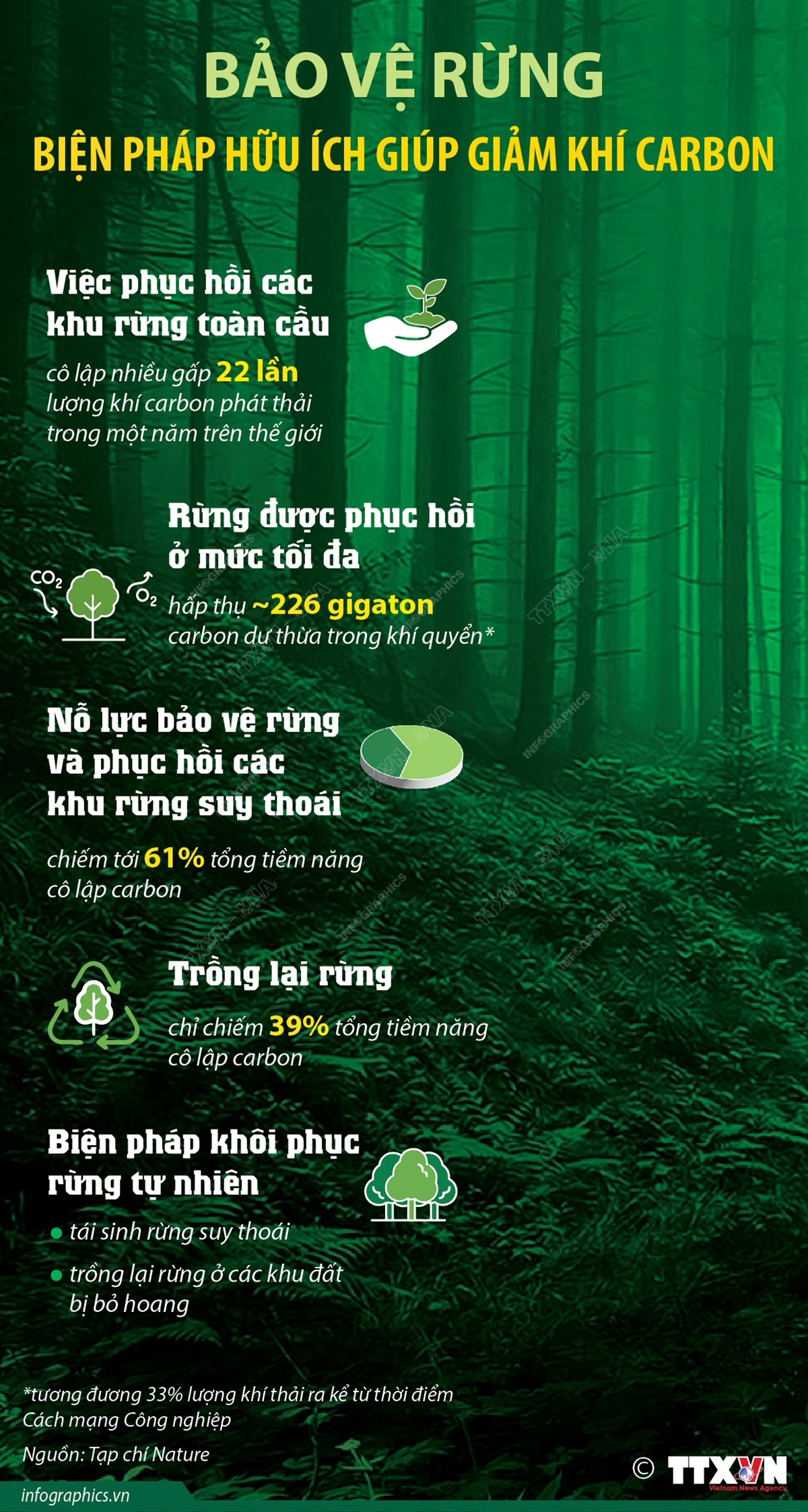 Nghiên cứu trên tạp chí Nature hồi giữa tháng 11/2023 chỉ ra rằng việc phục hồi các khu rừng toàn cầu có thể giúp cô lập lượng carbon nhiều gấp 22 lần lượng khí carbon phát thải trong một năm trên toàn thế giới. Đây là minh chứng cho thấy cây xanh là công cụ quan trọng trong ứng phó với biến đổi khí hậu, bên cạnh cam kết cắt giảm nhiên liệu hóa thạch.