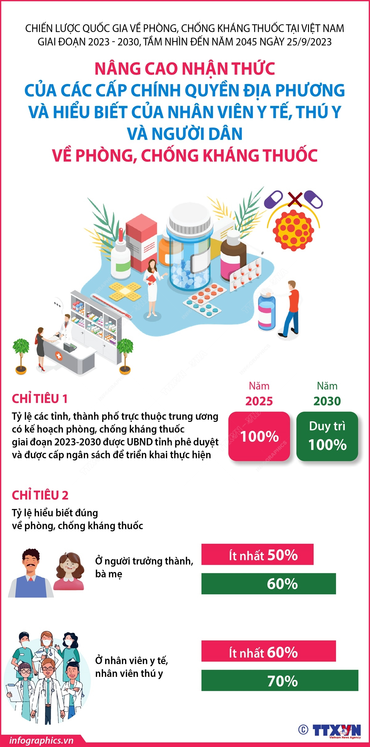 Từ ngày 20-21/11/2023, Bộ Y tế phối hợp với Bộ Nông nghiệp và Phát triển nông thôn, Bộ Tài nguyên và Môi trường, Bộ Công Thương và Tổ chức Y tế thế giới, Tổ chức FHI 360 và các đối tác tổ chức Hội nghị triển khai Chiến lược quốc gia về phòng, chống kháng thuốc tại Việt Nam giai đoạn 2023-2030, tầm nhìn đến năm 2045 và hưởng ứng "Tuần lễ thế giới nâng cao nhận thức về kháng thuốc". Chiến lược quốc gia về phòng, chống kháng thuốc tại Việt Nam giai đoạn 2023 - 2030, tầm nhìn đến năm 2045 đặt ra mục tiêu chung là: "Làm chậm sự tiến triển kháng thuốc và ngăn chặn, kiểm soát sự lây lan của các vi sinh vật kháng thuốc, bệnh truyền nhiễm, đồng thời đảm bảo sự sẵn có, liên tục các thuốc kháng vi sinh vật và sử dụng thuốc kháng vi sinh vật hợp lý để điều trị hiệu quả các bệnh truyền nhiễm ở người, động vật, góp phần bảo vệ, chăm sóc, nâng cao sức khỏe con người, động vật, bảo vệ môi trường, phát triển kinh tế, xã hội của đất nước.