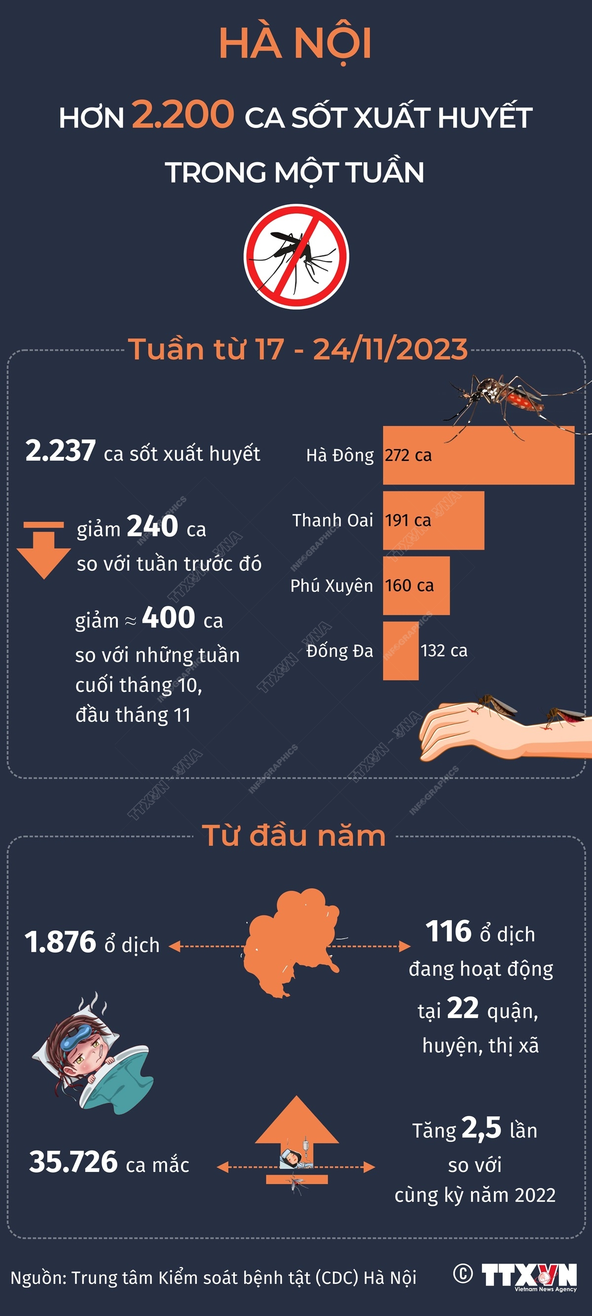 Theo Trung tâm Kiểm soát bệnh tật (CDC) Hà Nội, trong tuần từ ngày 17 đến 24/11, trên địa bàn thành phố ghi nhận 2.237 trường hợp mắc sốt xuất huyết tại 30 quận, huyện, thị xã (giảm gần 240 ca so với tuần trước đó và giảm khoảng 400 ca so với những tuần cuối tháng 10 và đầu tháng 11/2023). Từ đầu năm 2023 đến nay, Hà Nội ghi nhận 35.726 trường hợp mắc sốt xuất huyết (tăng gấp 2,5 lần so với cùng kỳ năm 2022), trong đó có 4 ca tử vong.