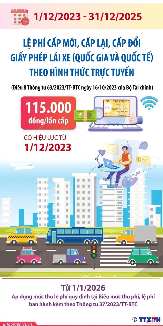 1/12/2023 - 31/12/2025: Lệ phí cấp mới, cấp lại, cấp đổi giấy phép lái xe online là 115.000 đồng
