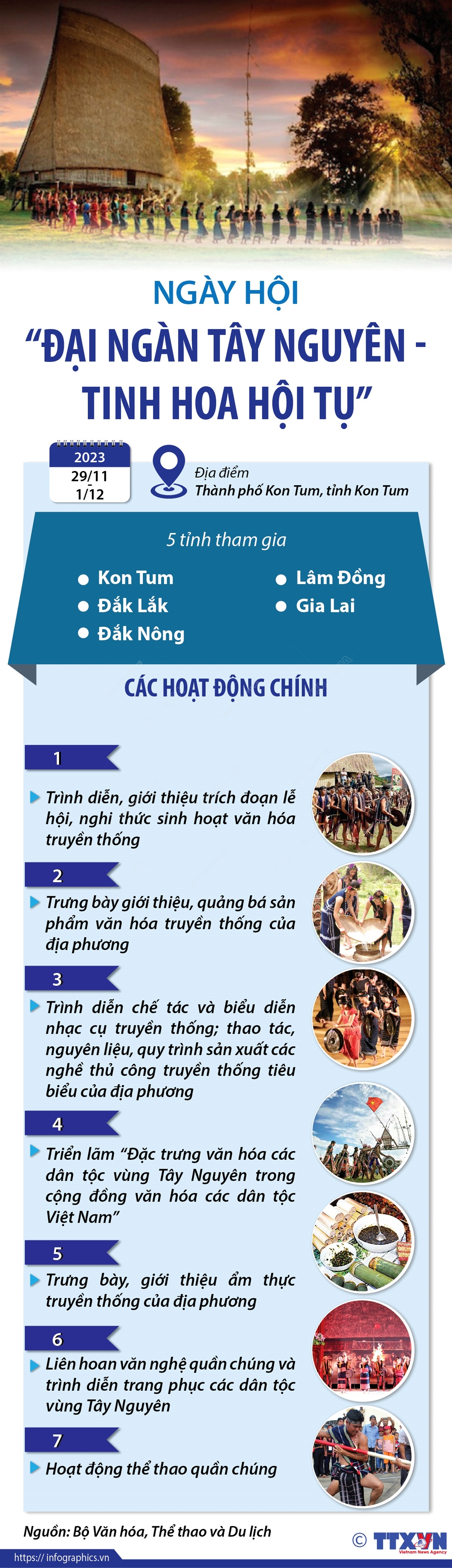 Ngày hội Văn hóa, thể thao và du lịch các dân tộc vùng Tây Nguyên với chủ đề “Đại ngàn Tây Nguyên - Tinh hoa hội tụ” diễn ra từ ngày 29/11 đến ngày 1/12 tại thành phố Kon Tum, tỉnh Kon Tum với sự tham gia của 5 tỉnh gồm Kon Tum, Đắk Lắk, Đắk Nông, Lâm Đồng, Gia Lai.