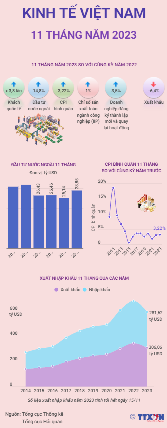 Trong 11 tháng năm 2023, CPI bình quân tăng 3,22%; đầu tư nước ngoài tăng 14,8%; cán cân thương mại ước tính xuất siêu 24,44 tỷ USD; khách quốc tế đến Việt Nam tăng 3,8 lần…